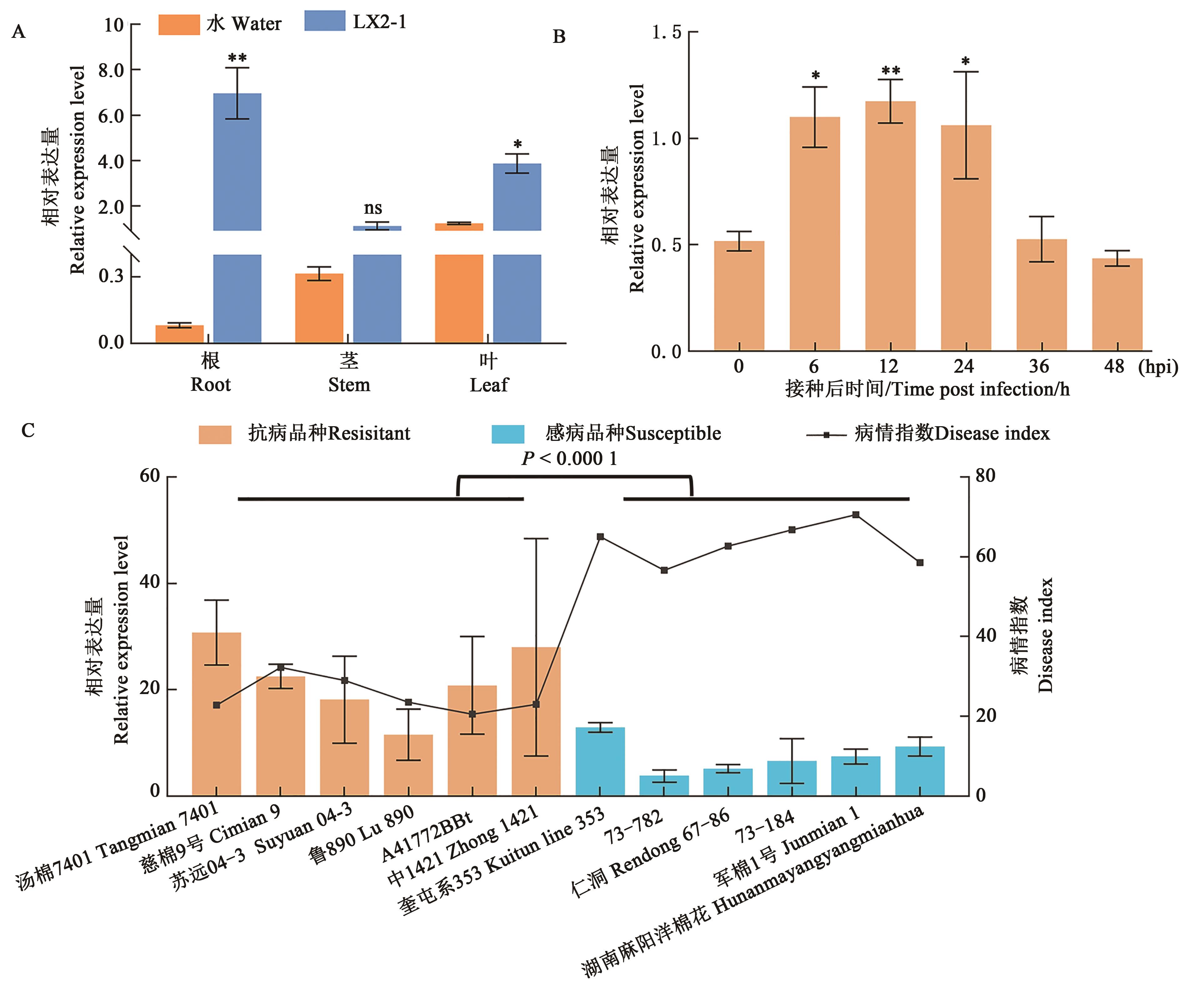 Fig. 3 Expression pattern of GhNAC1A: Expression analysis of GhNAC1 in different tissues and organs of ND601; B: Expression analysis of GhNAC1 in ND601 roots under Verticillium wilt stress; C: Expression analysis of GhNAC1 in roots of 12 different resistant cultivars under Verticillium wilt stress; * and ** indicate significant differences compared with 0 h at P < 0.05 and P < 0.01 levels, respectively