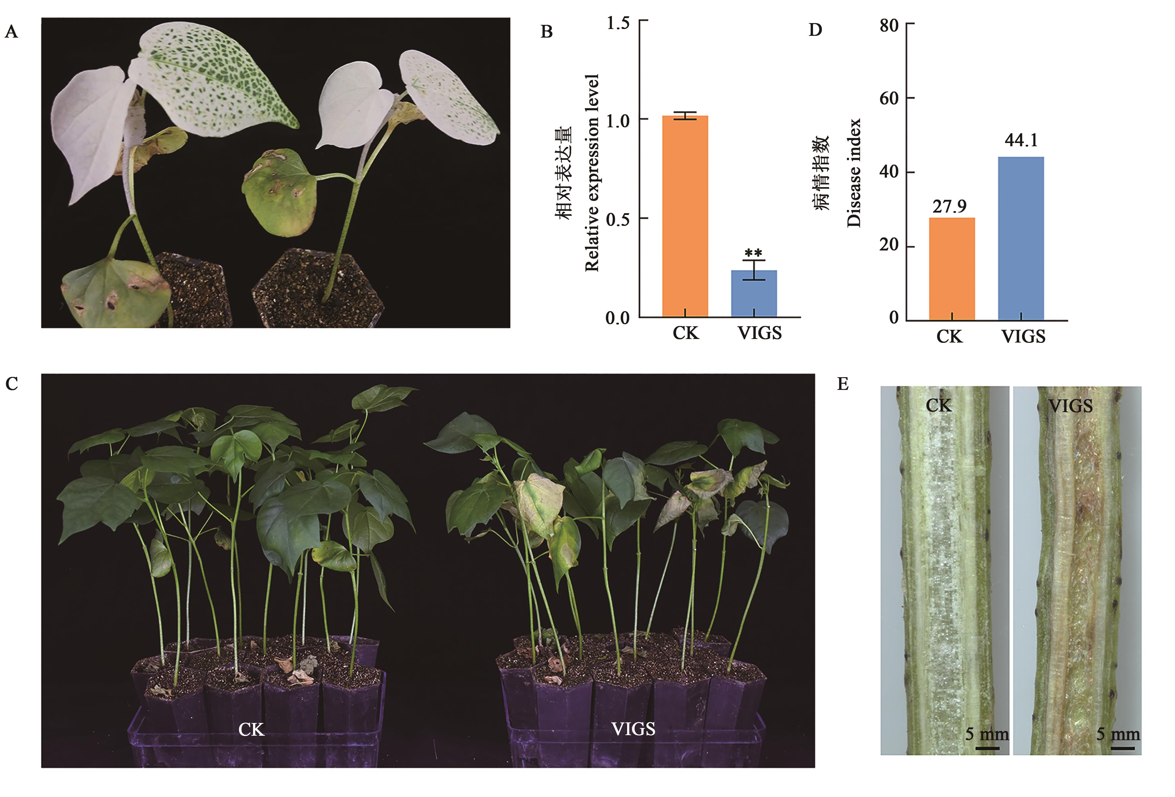 Fig. 4 Silencing GhNAC1 reduced the resistance to V. dahliae in cottonA: CLA1 gene was used as a positive control with an albino phenotype on leave after VIGS in cotton; B: Relative expression levels of GhNAC1 in WT and GhNAC1-silenced plants 7 d after hand-infiltration; C: Disease manifestations of control plants and silent plants at 20 dpi; D: Disease index; E: Phenotype of stem infected by V. dahliae. CK stands for control group, VIGS stands for silent group; ** indicates significant difference compared with CK at P < 0.01 level
