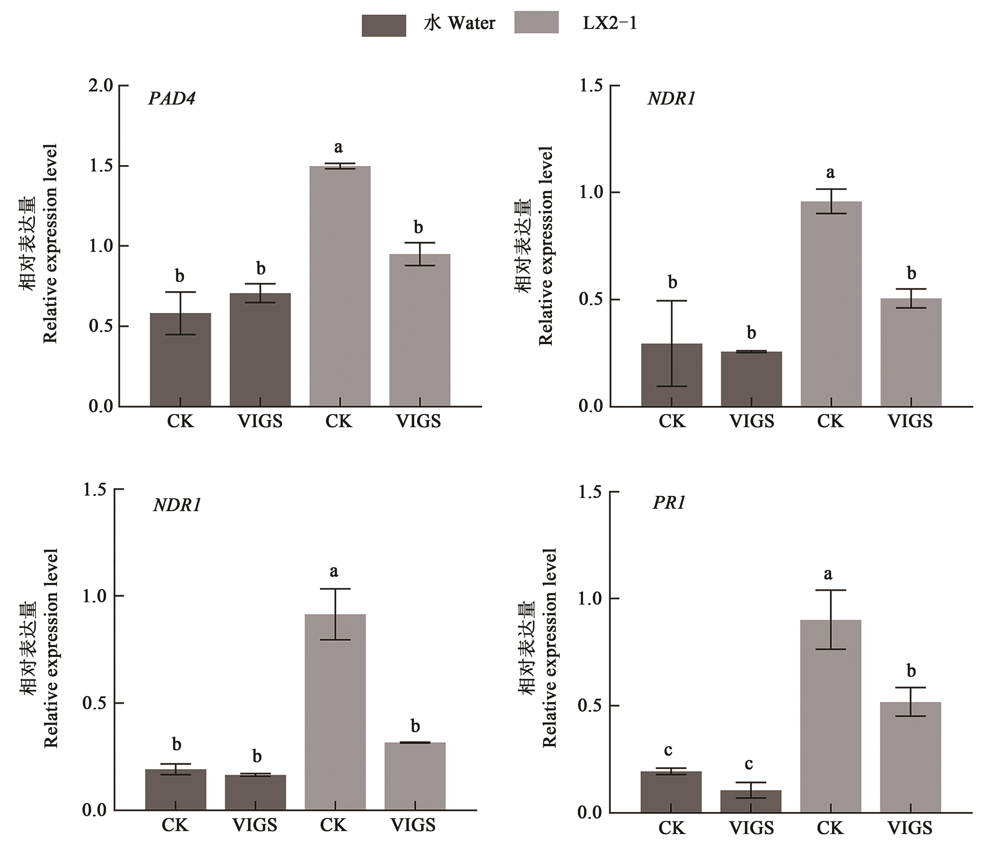 Fig. 5 Analysis of gene expression of salicylic acid pathway in GhNAC1 silenced cotton after inoculationNote:Different lowercase letters represent significant differences at P < 0.05 level.