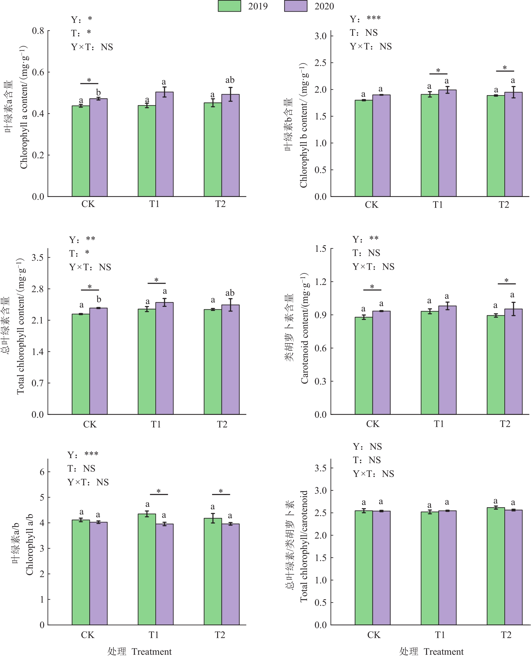 Fig. 2 Situations of the photosynthetic pigment content in continuous cropping C. tangshen Oliv. under using microbial fertilizersNote: Different lowercase letters of same year indicate significant differences among treatments at P<0.05 level. Y—Cultivated years;T—Types of microbial fertilizer;Y×T—Interaction effect of the cultivated years and types of microbial fertilizer;NS—No significant effect; *,** and *** indicate significant at P<0.05,P<0.01 and P<0.001 levels, respectively.