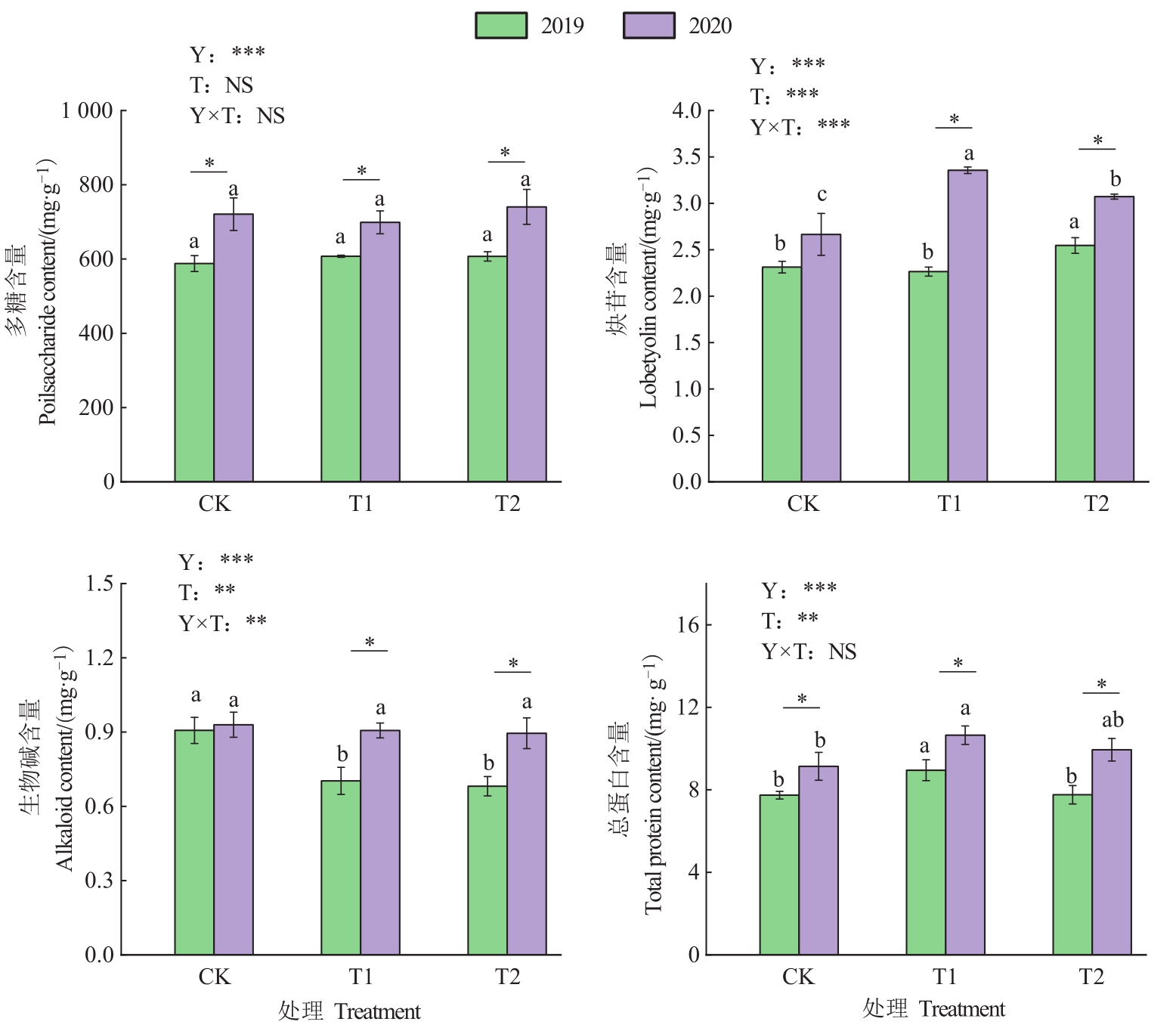 Fig. 4 Quality situations of continuous cropping C. tangshen Oliv.under using microbial fertilizersNote:Different lowercase letters of same year indicate significant differences among treatments at P<0.05 level. Y—Cultivated years;T—Types of microbial fertilizer;Y×T—Interaction effect of the cultivated years and types of microbial fertilizer;NS—No significant effect; *,** and *** indicate significant at P<0.05,P<0.01 and P<0.001 levels, respectively.