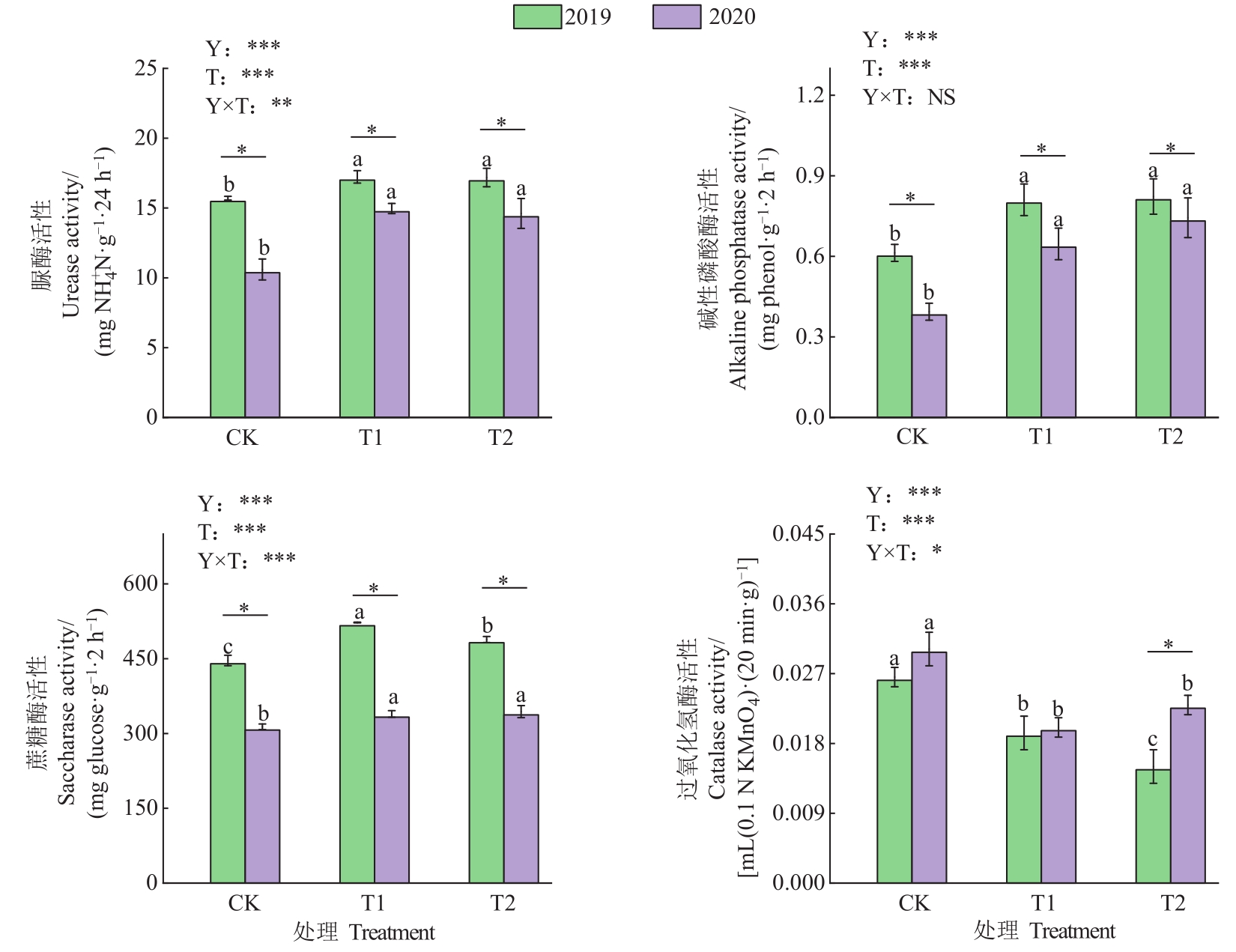 Fig. 5 Soil enzyme activities situations of continuous cropping C. tangshen Oliv. under using microbial fertilizersNote: Different lowercase letters of same year indicate significant differences among treatments at P<0.05 level. Y—Cultivated years;T—Types of microbial fertilizer;Y×T—Interaction effect of the cultivated years and types of microbial fertilizer;NS—No significant effect; *,** and *** indicate significant at P<0.05,P<0.01 and P<0.001 levels, respectively.