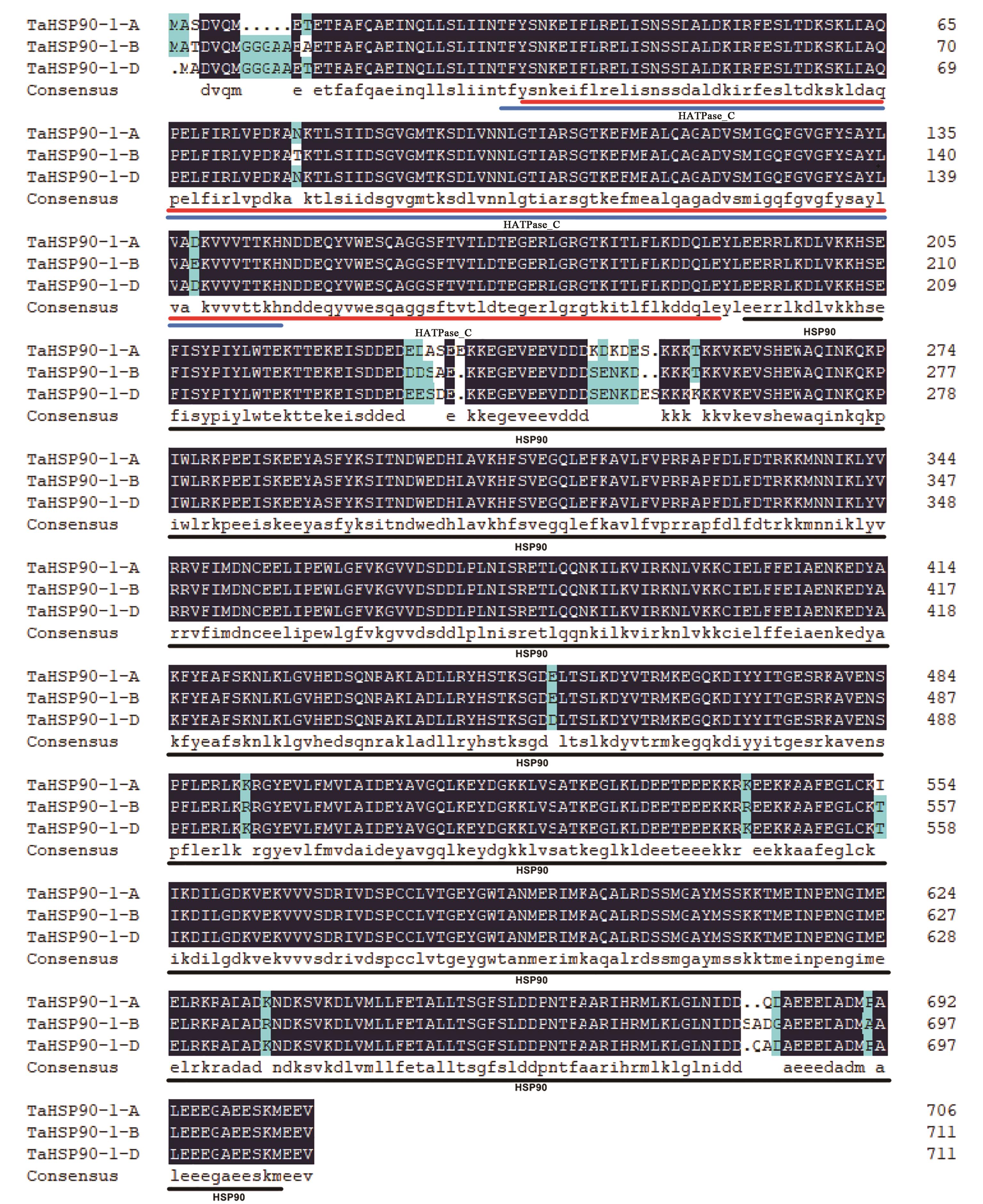 Fig. 1 Multi sequence alignment of TaHSP90-1 homologous proteinNote:The amino acid sequence on the dark blue background indicates that the sequence is completely matched; the amino acid sequence on the light blue background indicates that the amino acid sequence matching is different; the blue and red underline indicates HATPase_C domain; the black underline indicates HSP90 domain.