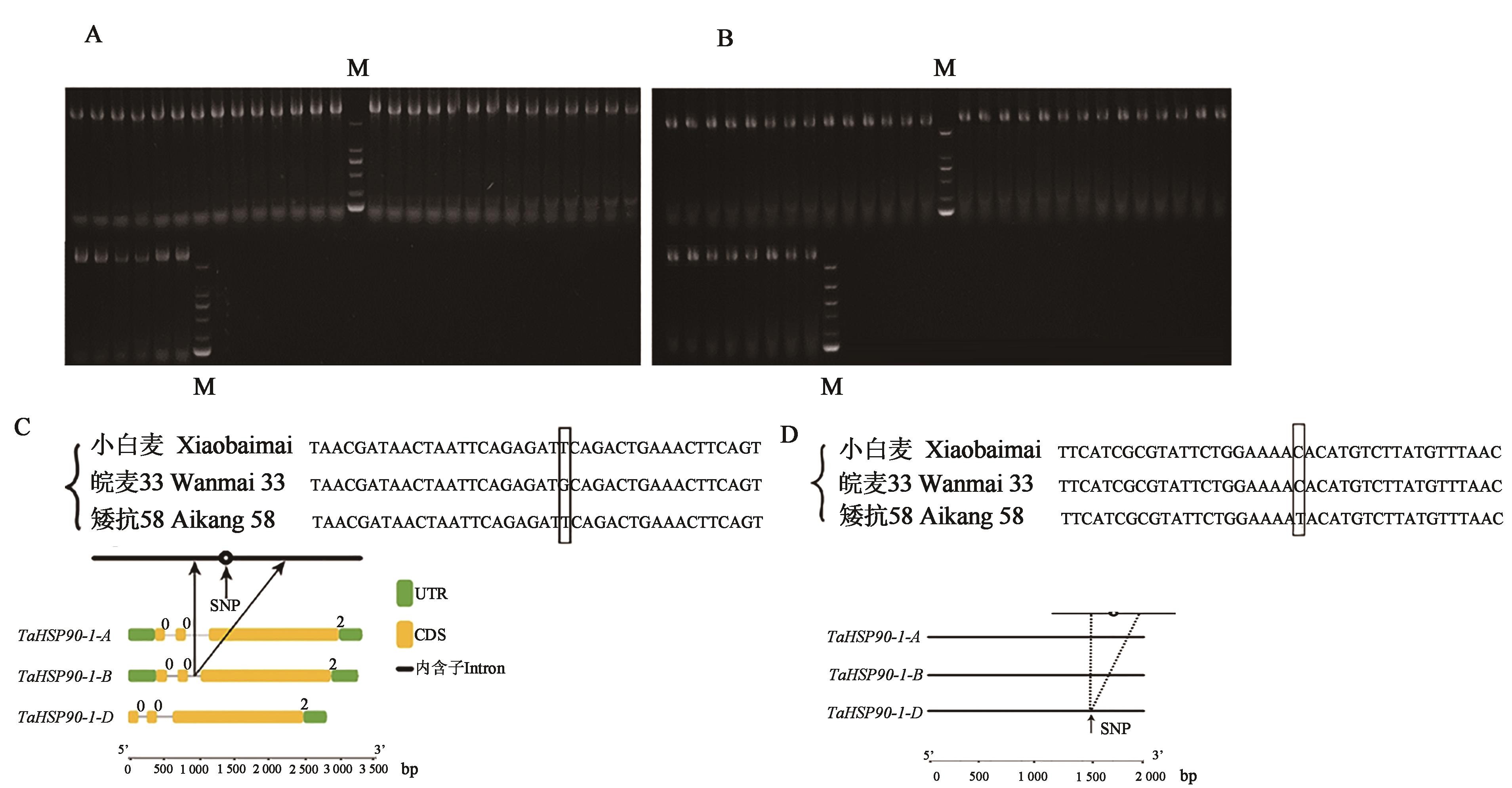 Fig. 2 Amplification results and analysis of the full-length sequence and promoter of wheat TaHSP90-1 geneA:Full length amplification of wheat TaHSP90-1 gene; B:Amplification results of wheat TaHSP90-1 promoter; C:Sketch map of structure and sequence variation of gene TaHSP90-1 in Xiaobaimai,Wanmai 33 and Aikang 58; D:Sketch map of structure and sequence variation of gene TaHSP90-1 promoter in Xiaobaimai,Wanmai 33 and Aikang 58. M—DL 2 000 marker; UTR—Untranslated region; CDS—Coding sequence