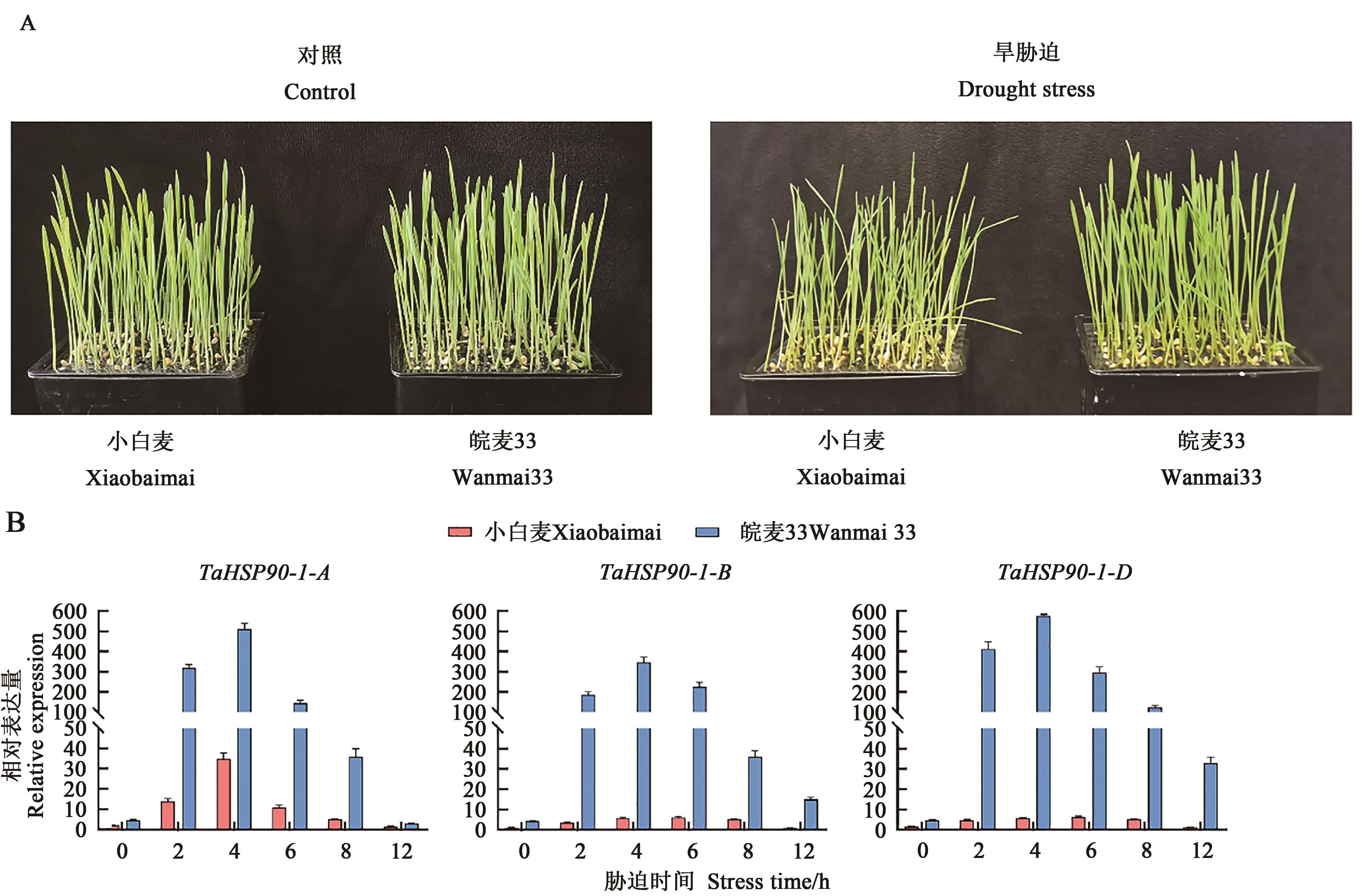 Fig. 5 Expression analysis of wheat TaHSP90-1 in different varieties under drought stressA: 12 h growth of Xiaobaimai and Wanmai 33 under drought stress; B: Expression of TaHSP90-1 gene in Xiaobaimai and Wanmai 33 after drought stress