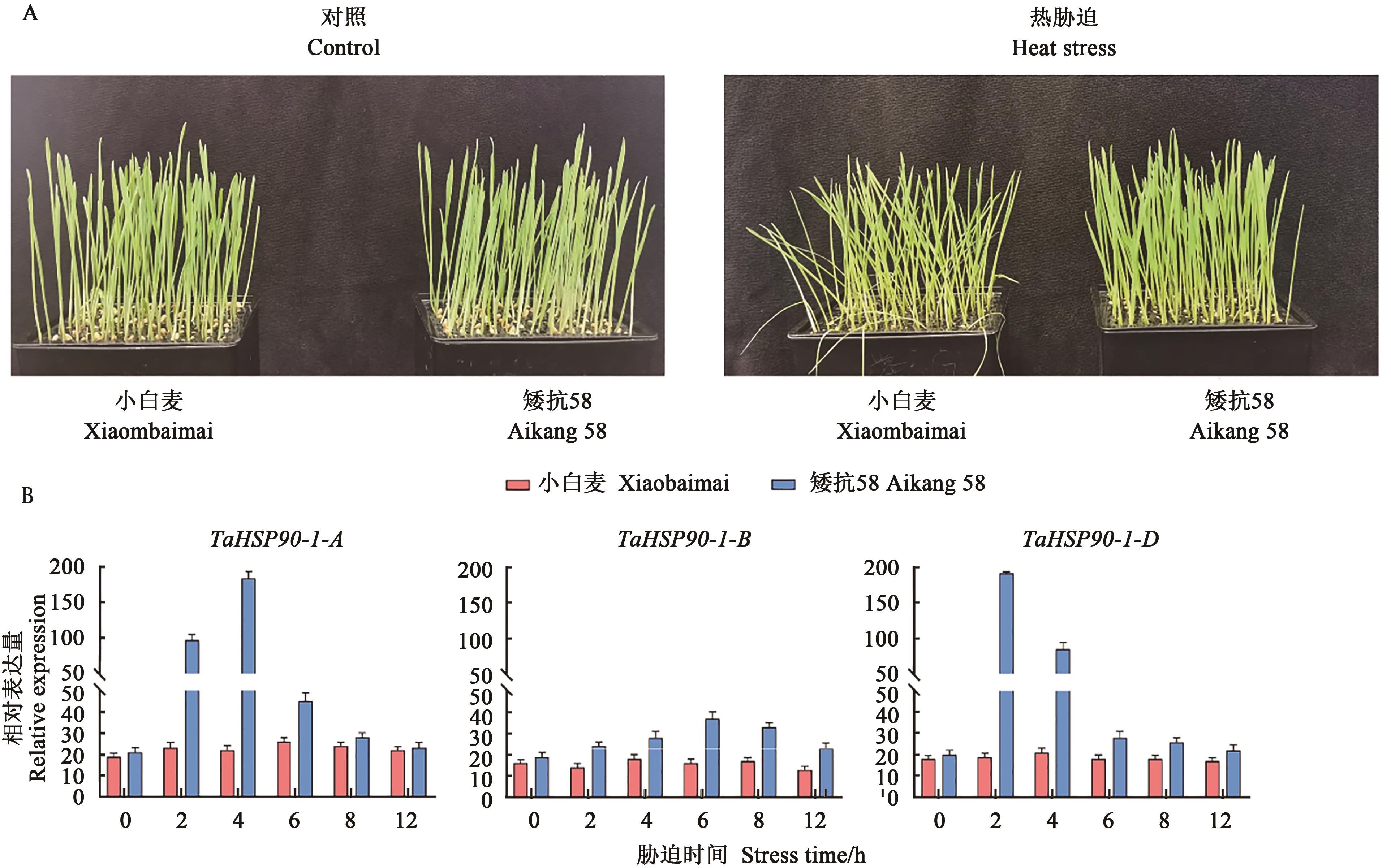 Fig. 6 Expression analysis of wheat TaHSP90-1 in different varieties under heat stressA: Phenotype of Xiaobaimai and Aikang 58 after heat stress 12 h; B: Expression of TaHSP90-1 gene in Xiaobaimai and Aikang 58 after heat stress