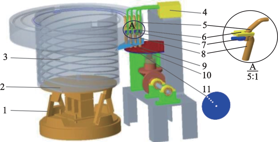 Fig. 1 Structure of seed metering deviceNote:1—Seed supply device; 2—Hopper; 3—Spiral guide; 4—Solenoid valve; 5—Sorting tube; 6—Photoelectric sensor; 7—Blow nozzle valve; 8—Seed filling tube; 9—Tank return seed; 10—Up seed plate; 11—Lower seed plate.