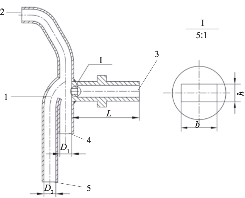 Fig. 3 Blowing deviceNote:1—Gas-solid two phase flow mixing pipeline; 2—Seeds entrance; 3—Air inlet; 4—Parting outlet; 5—Gas-solid two phase flow outlet.