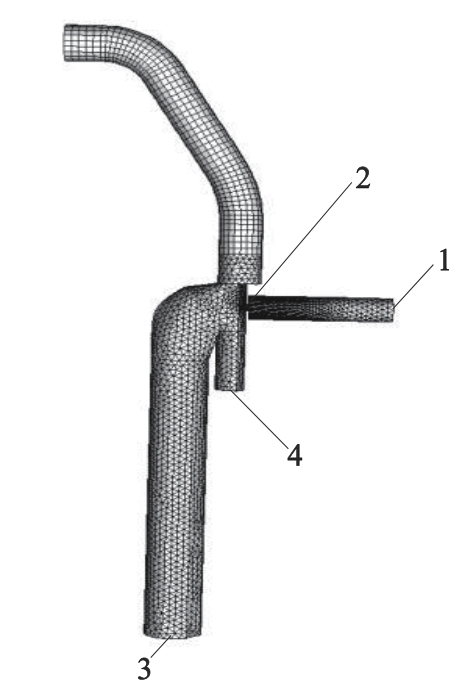 Fig. 5 Grid of blowing-deviceNote:1—Air pressure inlet; 2—Air velocity inlet; 3—Gas-solid two phase flow pressure outlet; 4—Discharge pressure outlet.
