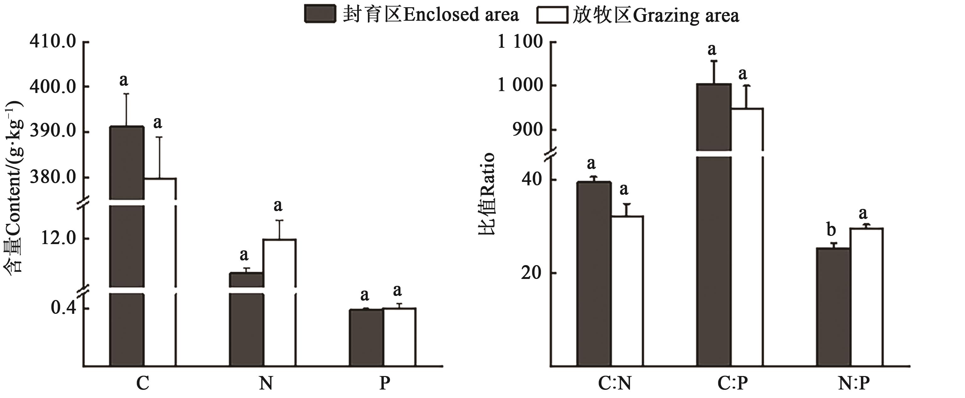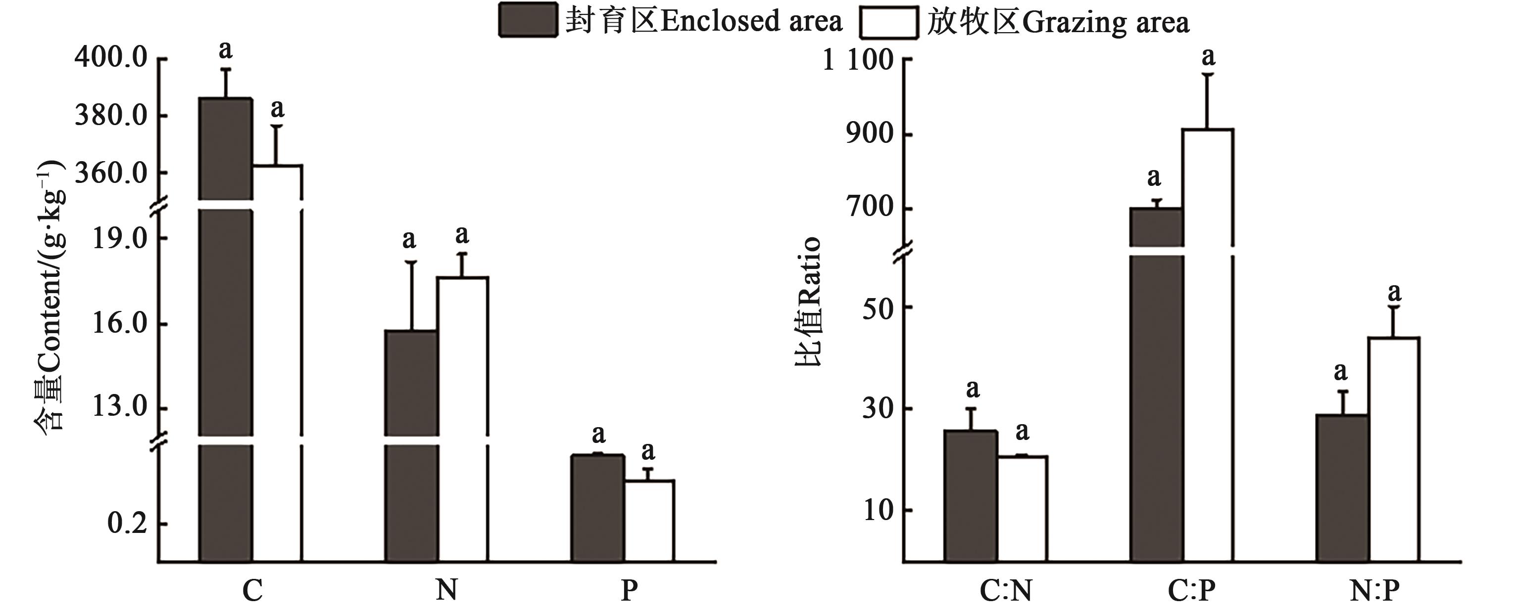 Fig. 1 C, N and P contents of plant stems and stoichiometric characteristics in Artemisia desert plant communities under fencing and sealingNote: Different lowercase letters in same index indicate significant differences at P < 0.05 level.