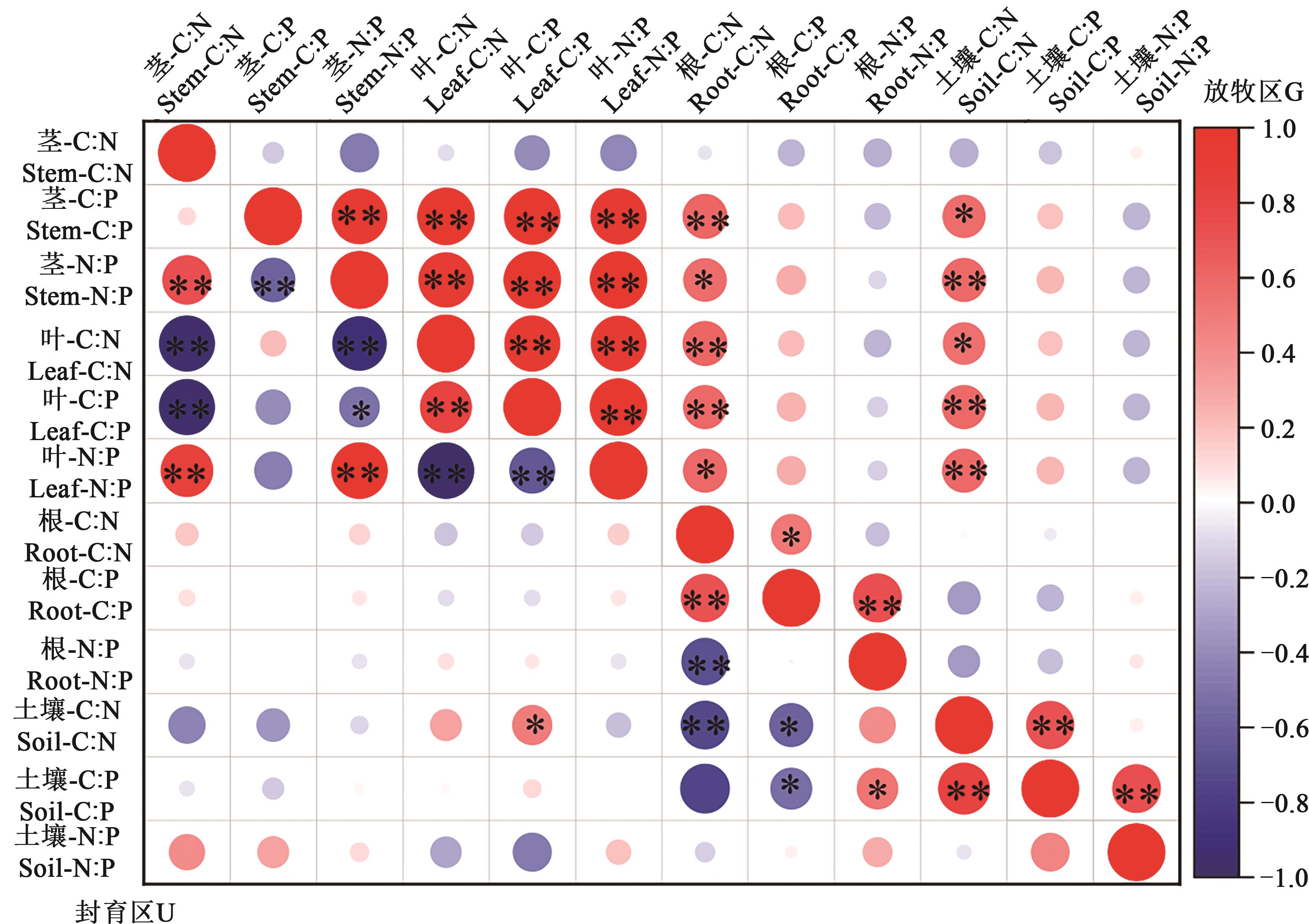Fig. 5 Correlation analysis of stoichiometric characteristics of plant and soil nutrientsNote: Lower left corner is the enclosed area (U) and the upper right corner is the grazing area (G); red represents positive correlation and blue represents negative correlation, the darker the color is, the greater the correlation coefficient is; * and ** indicate significant correlations at P<0.05 and P<0.01 levels,respectively.