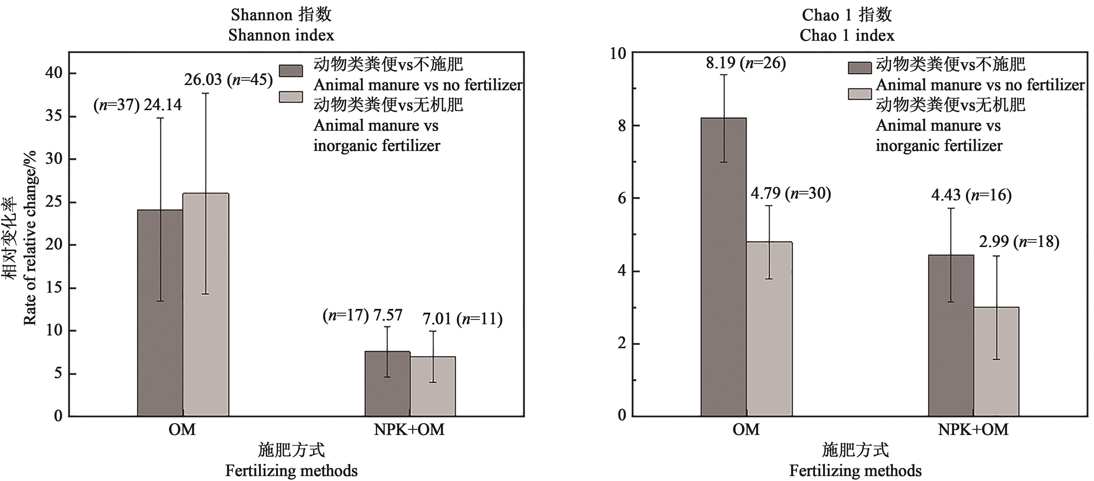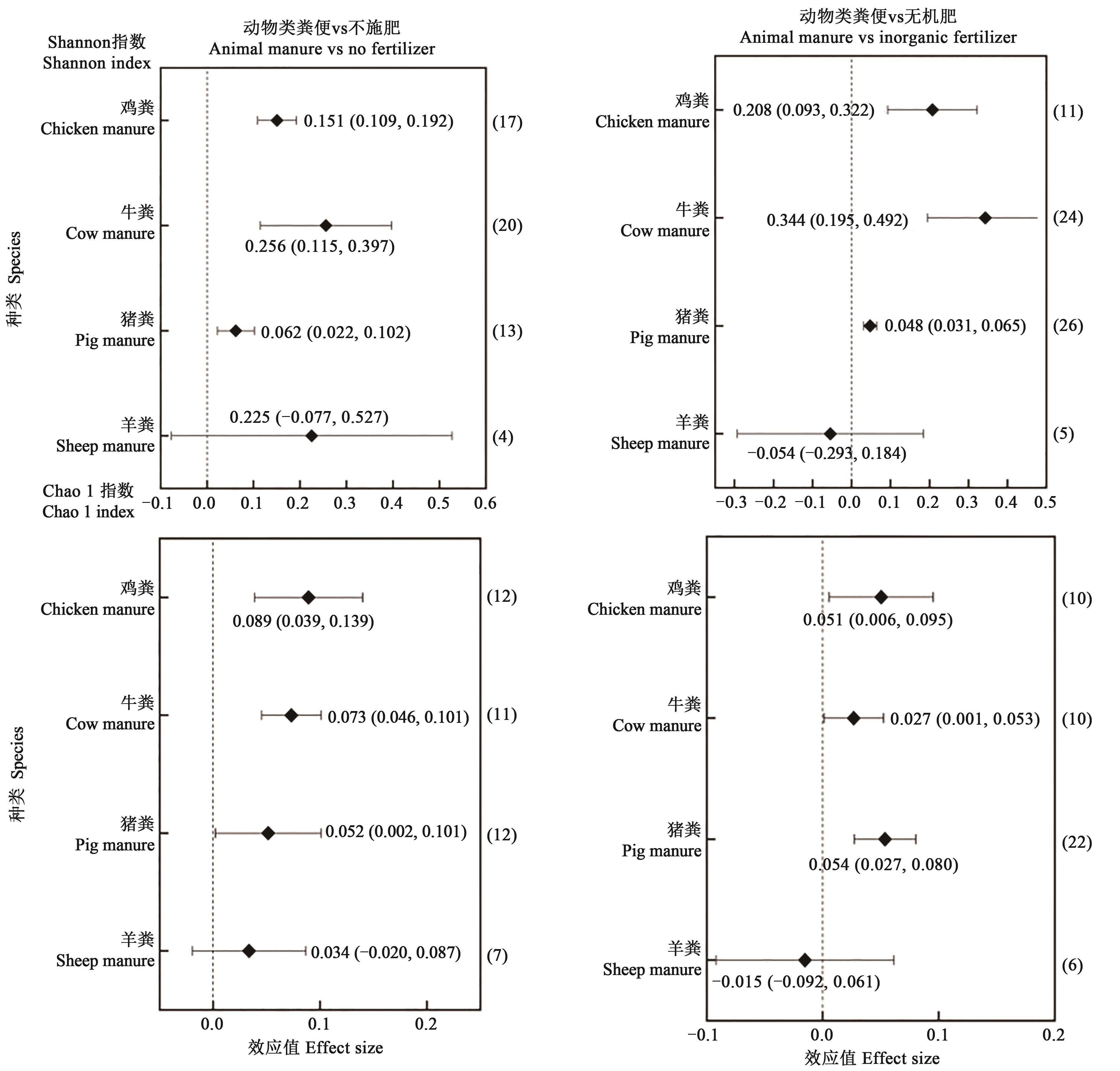Fig. 1 Effect of manure application on soil bacterial diversity indexNote: The value of the horizontal axis corresponding to the diamond points in the figure represents the effect value (lnR++); the upper and lower bound of the horizontal line represents the 95% confidence interval; the numbers in the brackets on the right are data statistics.