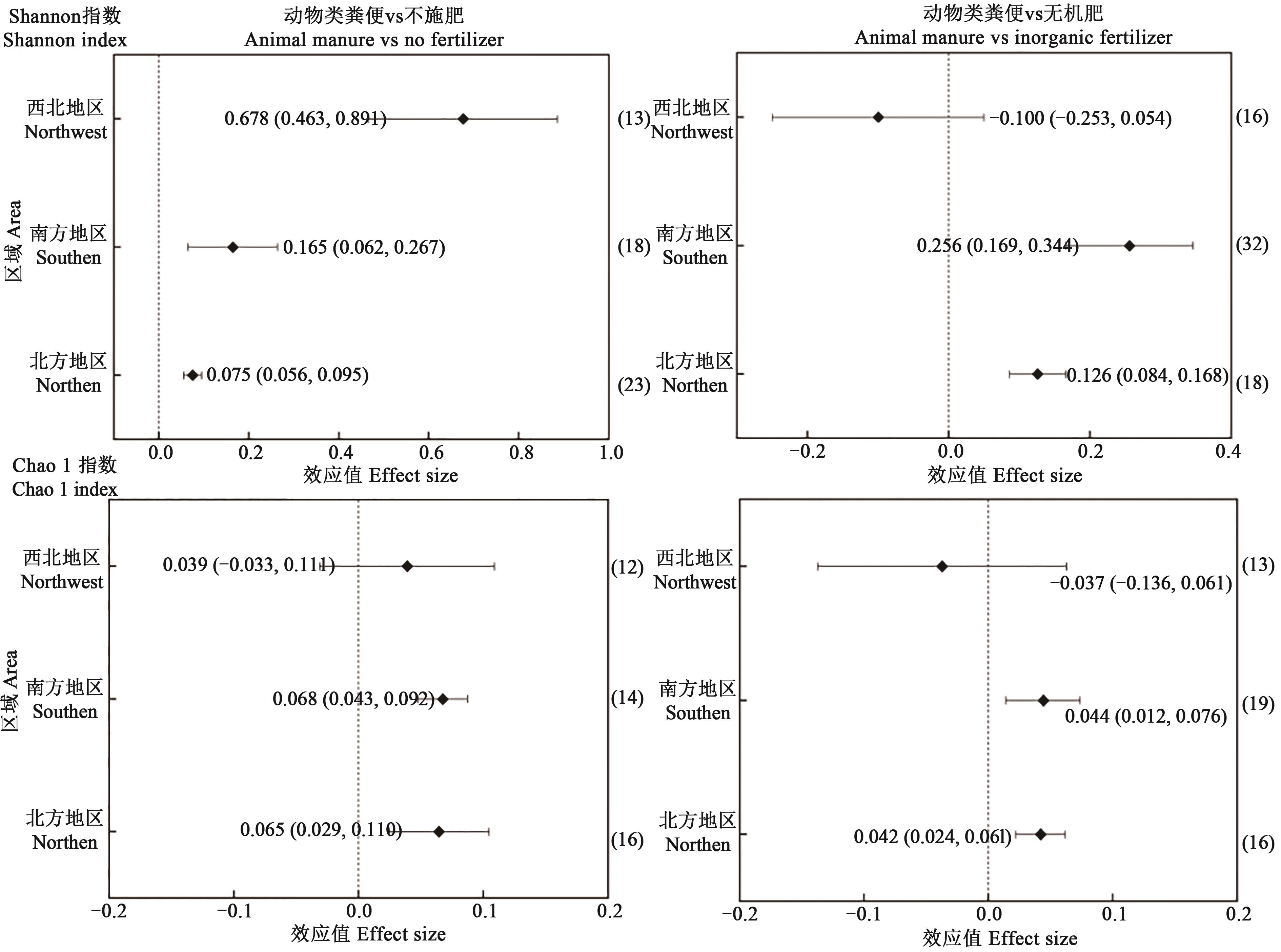 Fig. 4 Effects of animal manure application on soil bacterial diversity index in different areasNote: The value of the horizontal axis corresponding to the diamond points in the figure represents the effect value (lnR++); the upper and lower bound of the horizontal line represents the 95% confidence interval; the numbers in the brackets on the right are data statistics.