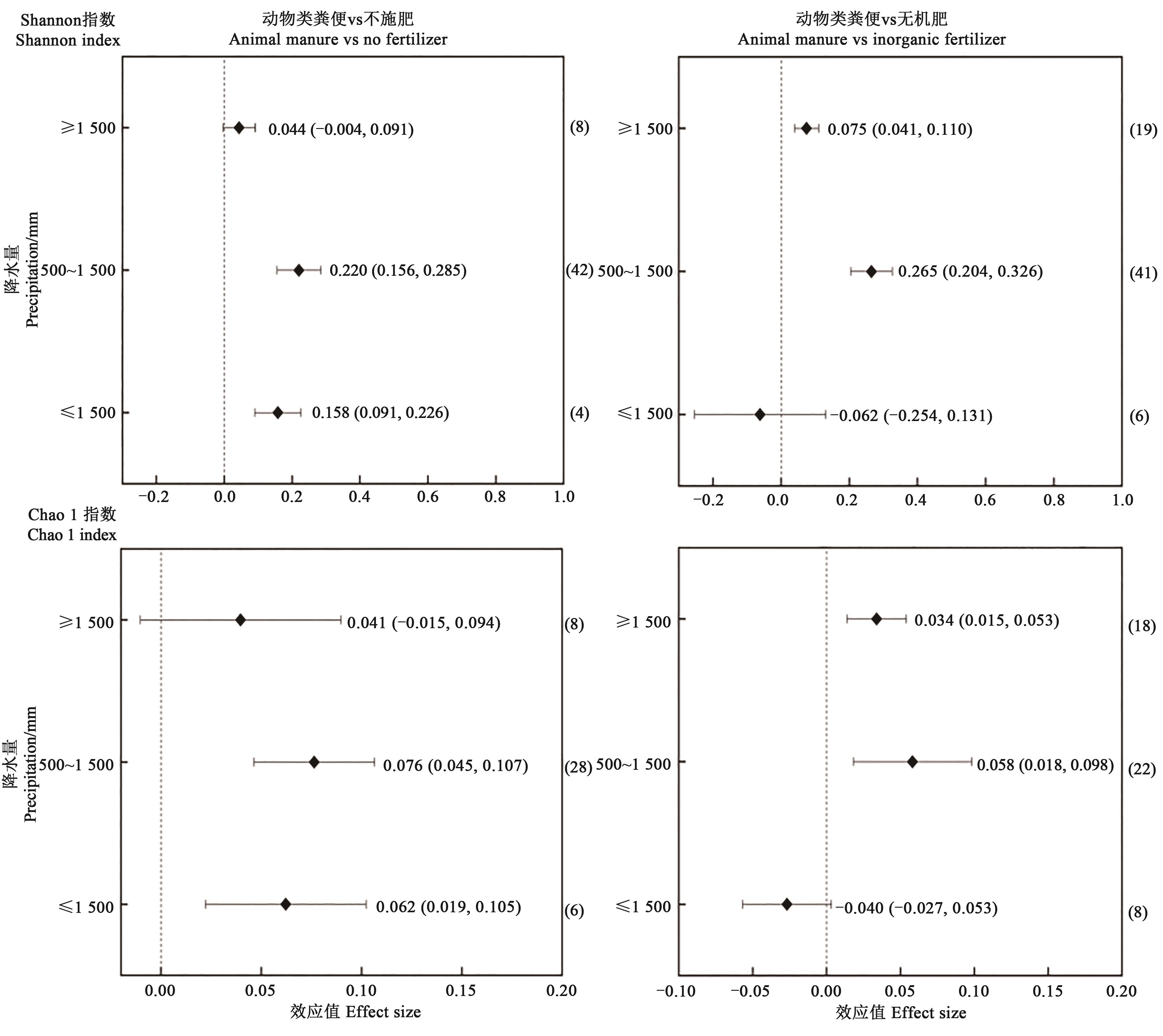 Fig. 5 effect of animal manure application on soil bacterial diversity index under different precipitationNote:The value of the horizontal axis corresponding to the diamond points in the figure represents the effect value (lnR++);the upper and lower bound of the horizontal line represents the 95% confidence interval; the numbers in the brackets on the right are data statistics.