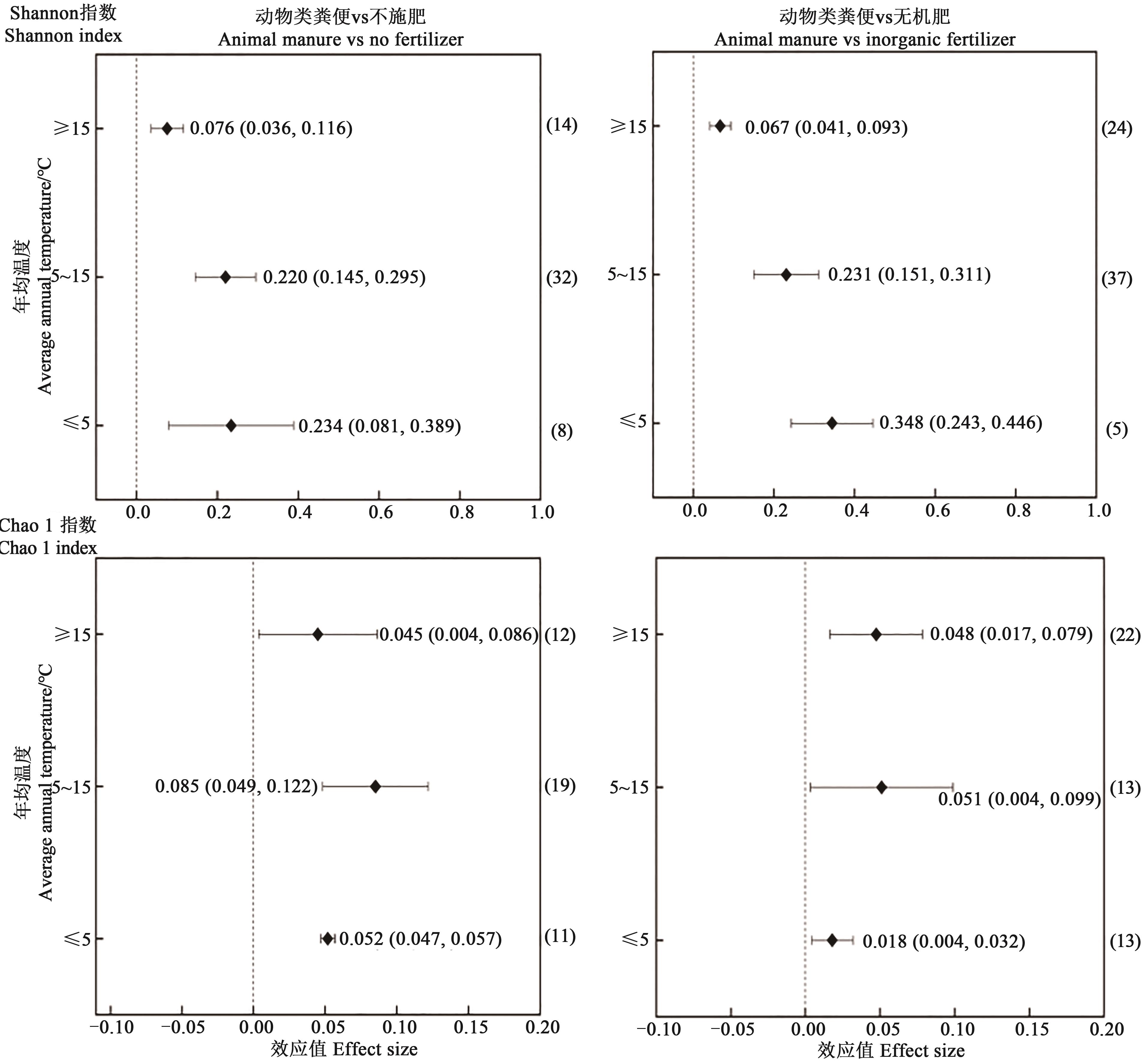 Fig. 6 Effects of animal manure application on soil bacterial diversity index at different annual temperaturesNote:The value of the horizontal axis corresponding to the diamond points in the figure represents the effect value (lnR++);the upper and lower bound of the horizontal line represents the 95% confidence interval; the numbers in the brackets on the right are data statistics.