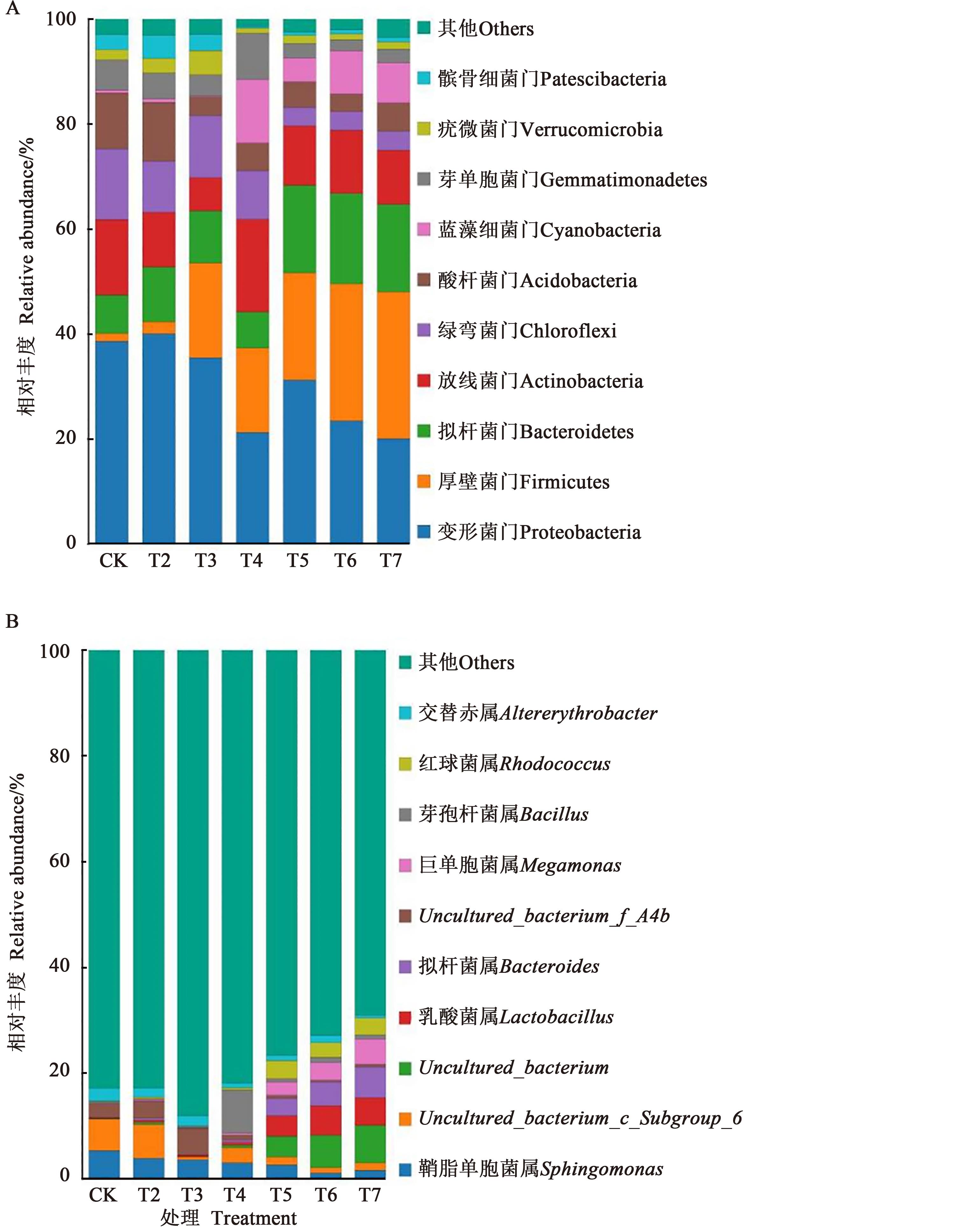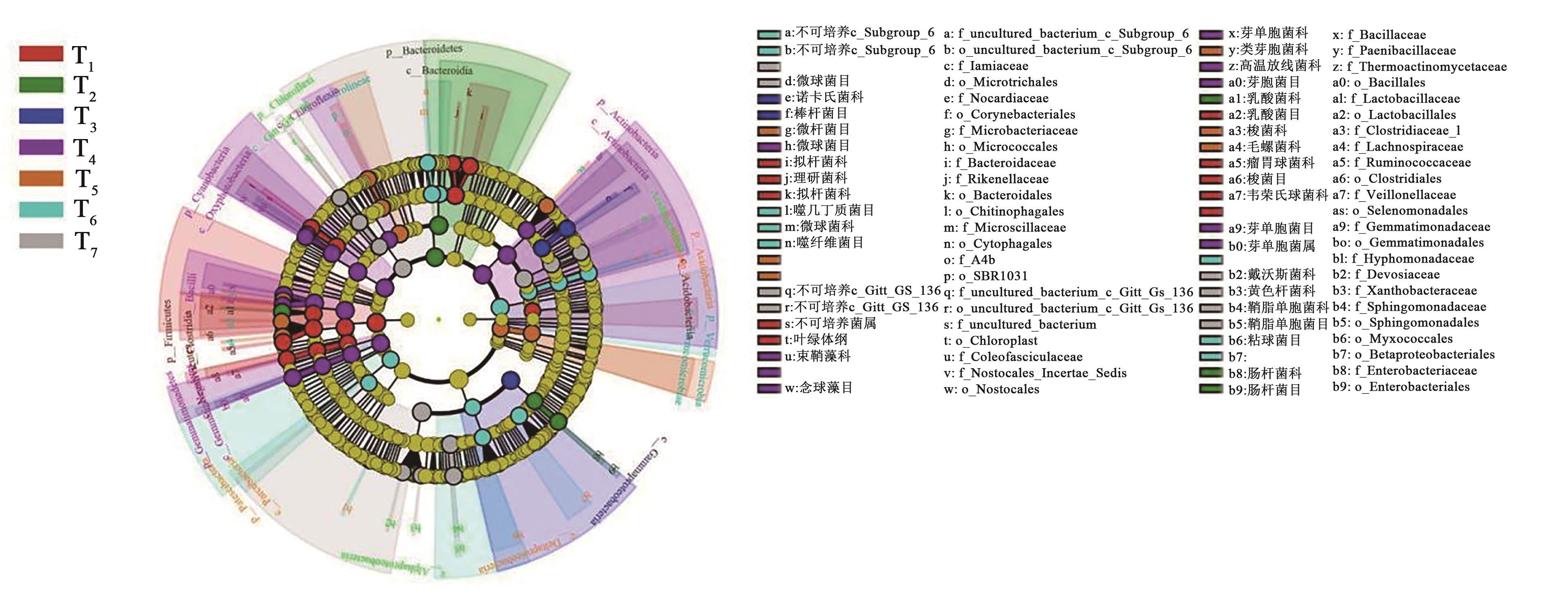 Fig. 3 Cladogram of soil bacterial community under different treatmentsNote: Each circle at a different classification level represents the classification at that level, yellow indicates no significant change in relative abundance, diameter of the circular indicates relative abundance.