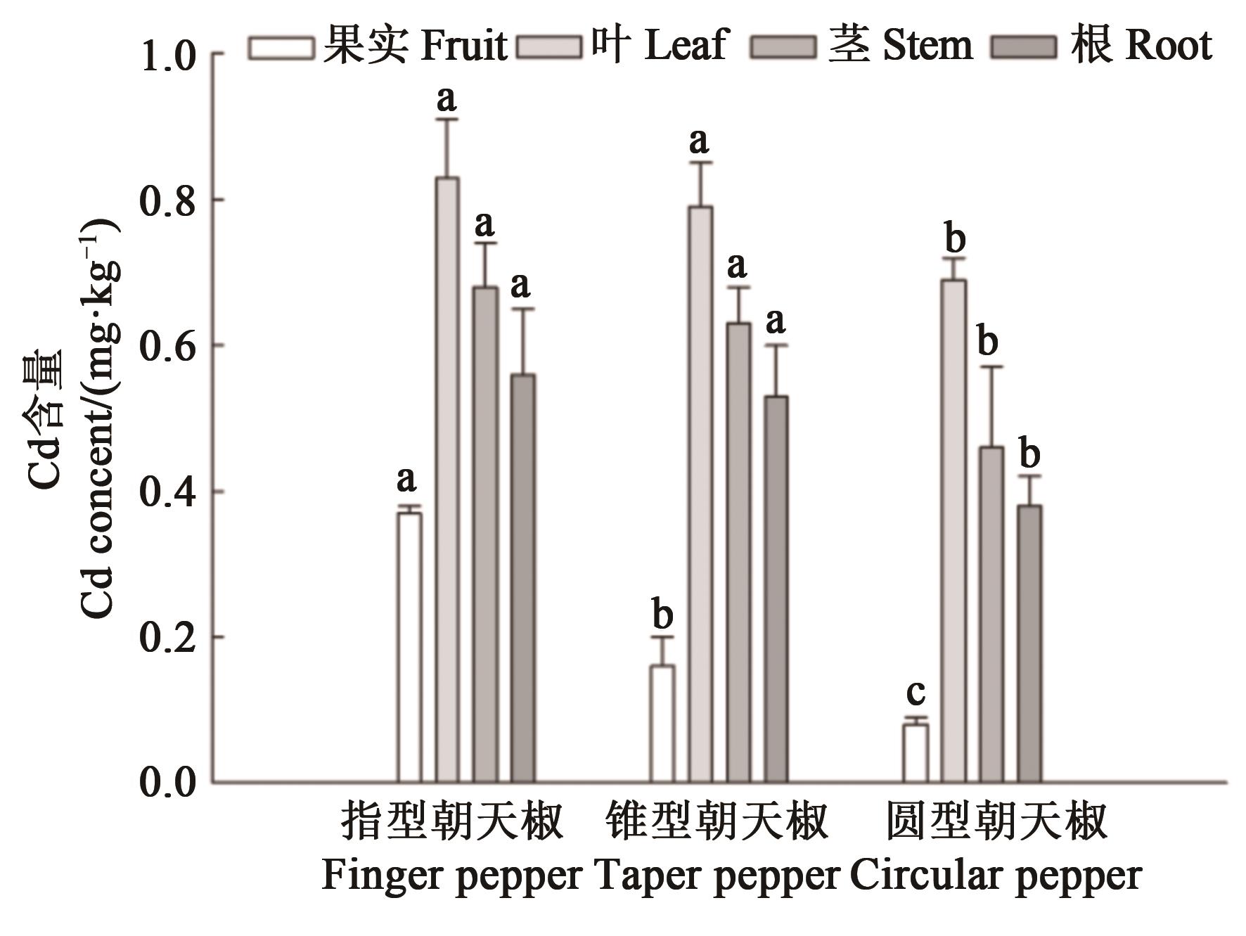 Fig. 3 Cd contents in different part of three types of peppersNote:Different lowercase letters in the same part indicate significant differences of Cd content between different genotype pepper at P<0.05 level.