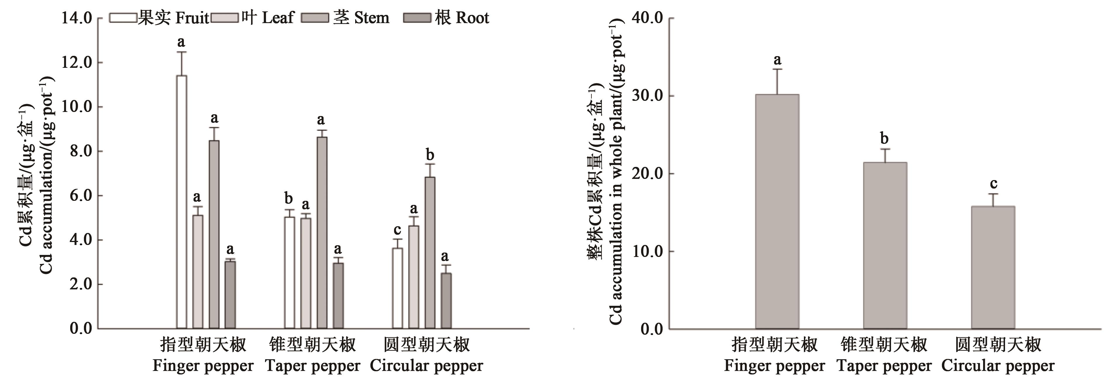 Fig. 4 Cd accumulation in different part and whole plant of three types of peppersNote:Different lowercase letters on the columns indicate significant differences of Cd accumulation in the same part of different genotype pepper at P<0.05 level.