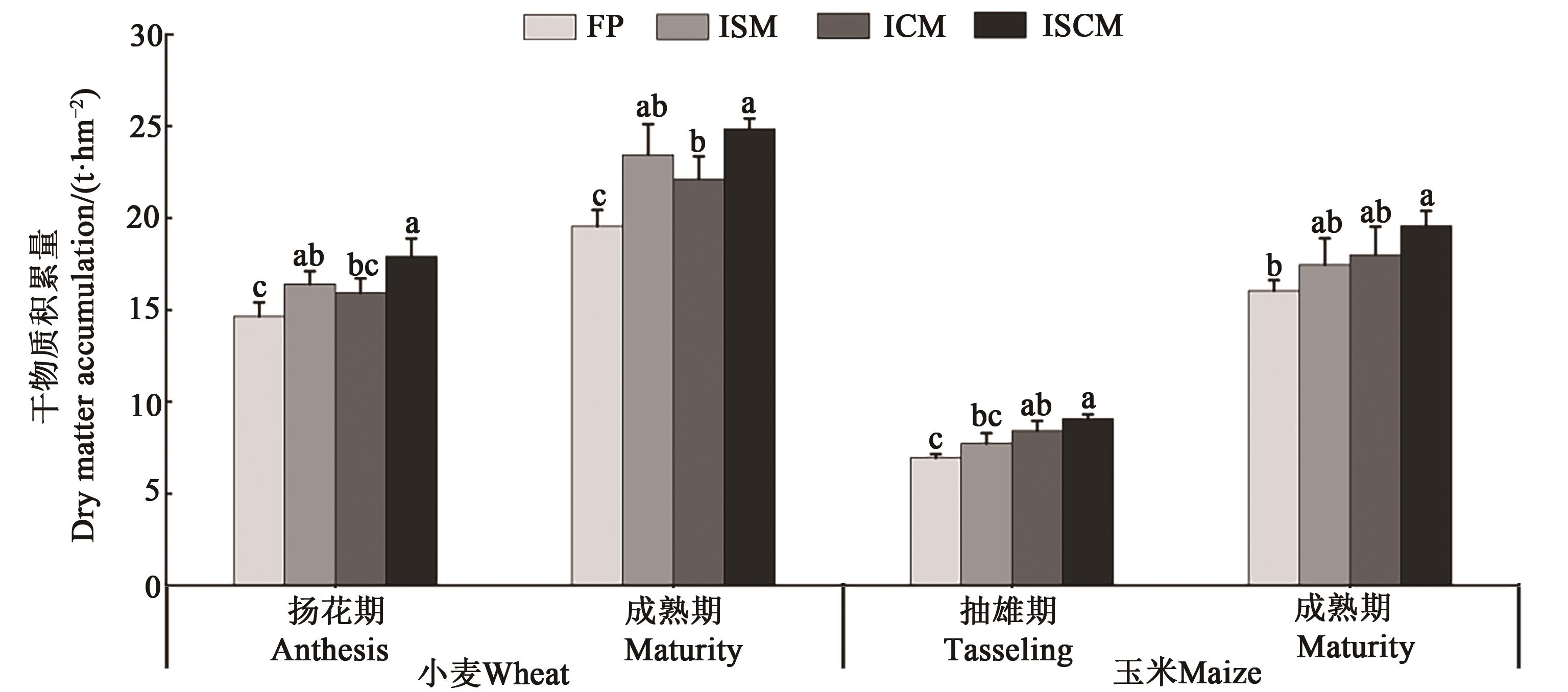 Fig. 2 Dry matter accumulation of wheat and maize under different improvement treatmentsNote:Different lowercase letters under the conditions of same crop and same period indicate significant differences among treatments at P < 0.05 level.
