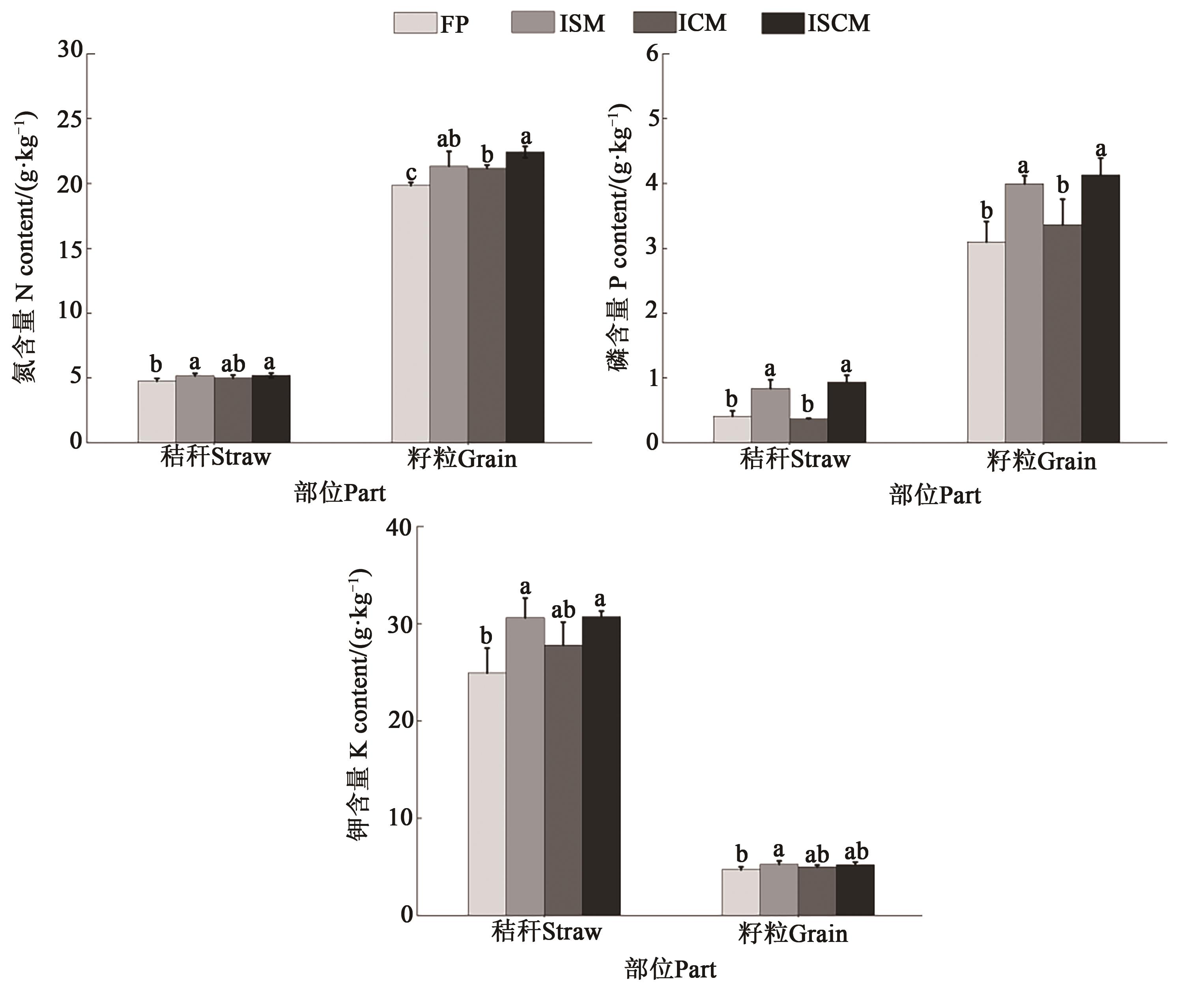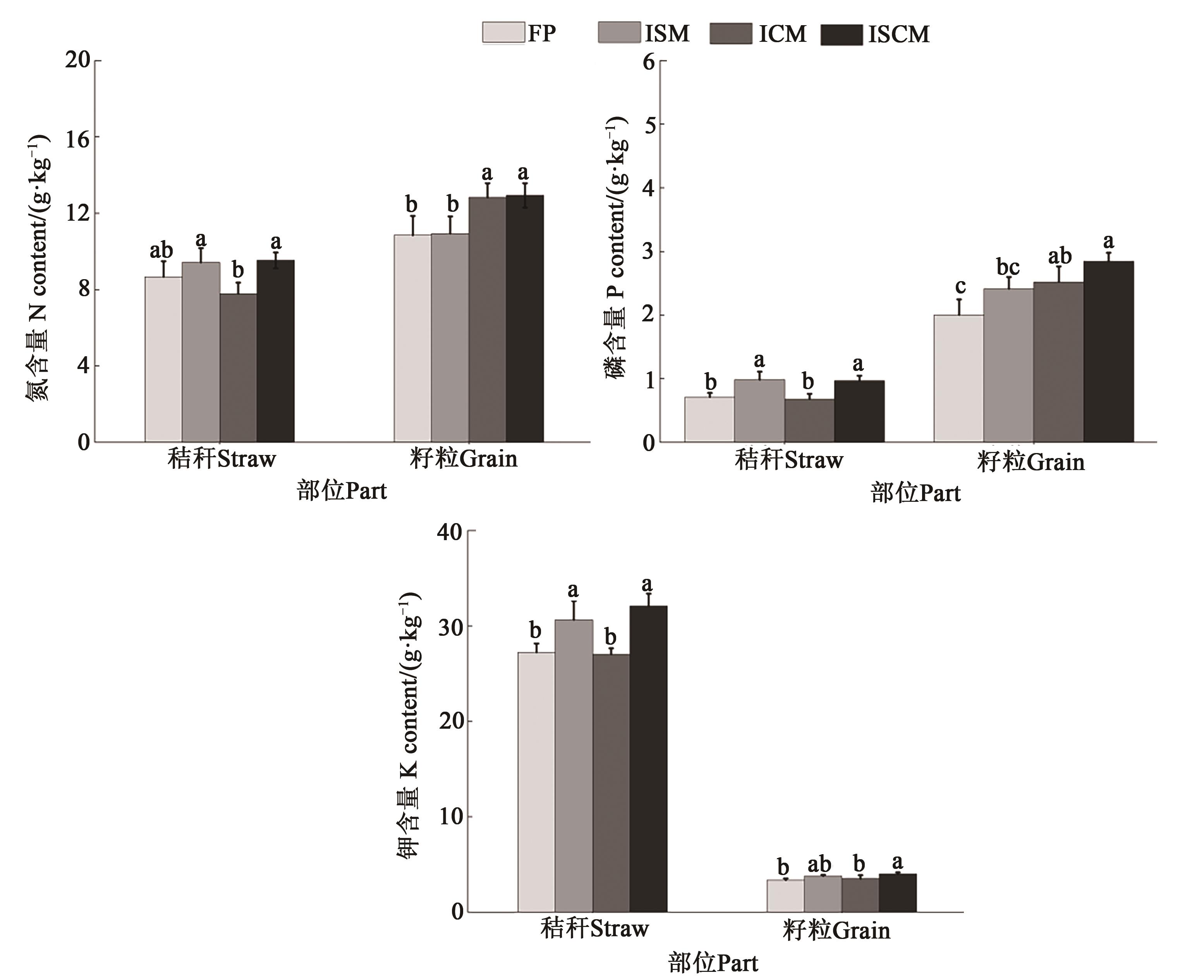 Fig. 3 Nitrogen, phosphorus and potassium contents of wheat plants under different improved treatmentsNote:Different lowercase letters of same organ indicate significant differences among treatments at P<0.05 level.