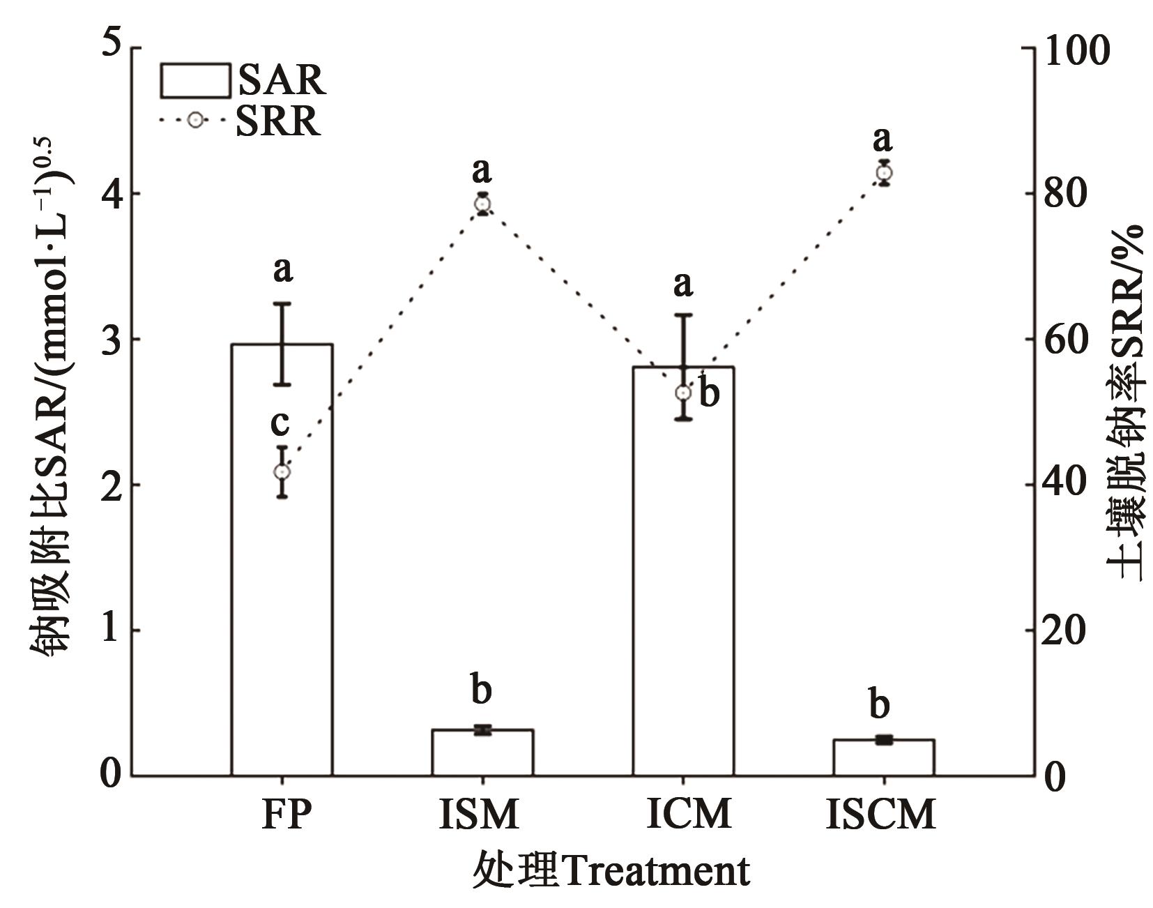 Fig. 5 SAR and SRR of topsoil under different treatmentsNote:Different uppercase and lowercase letters indicate significant differences in SAR and SRR among treatments at P<0.05 level.