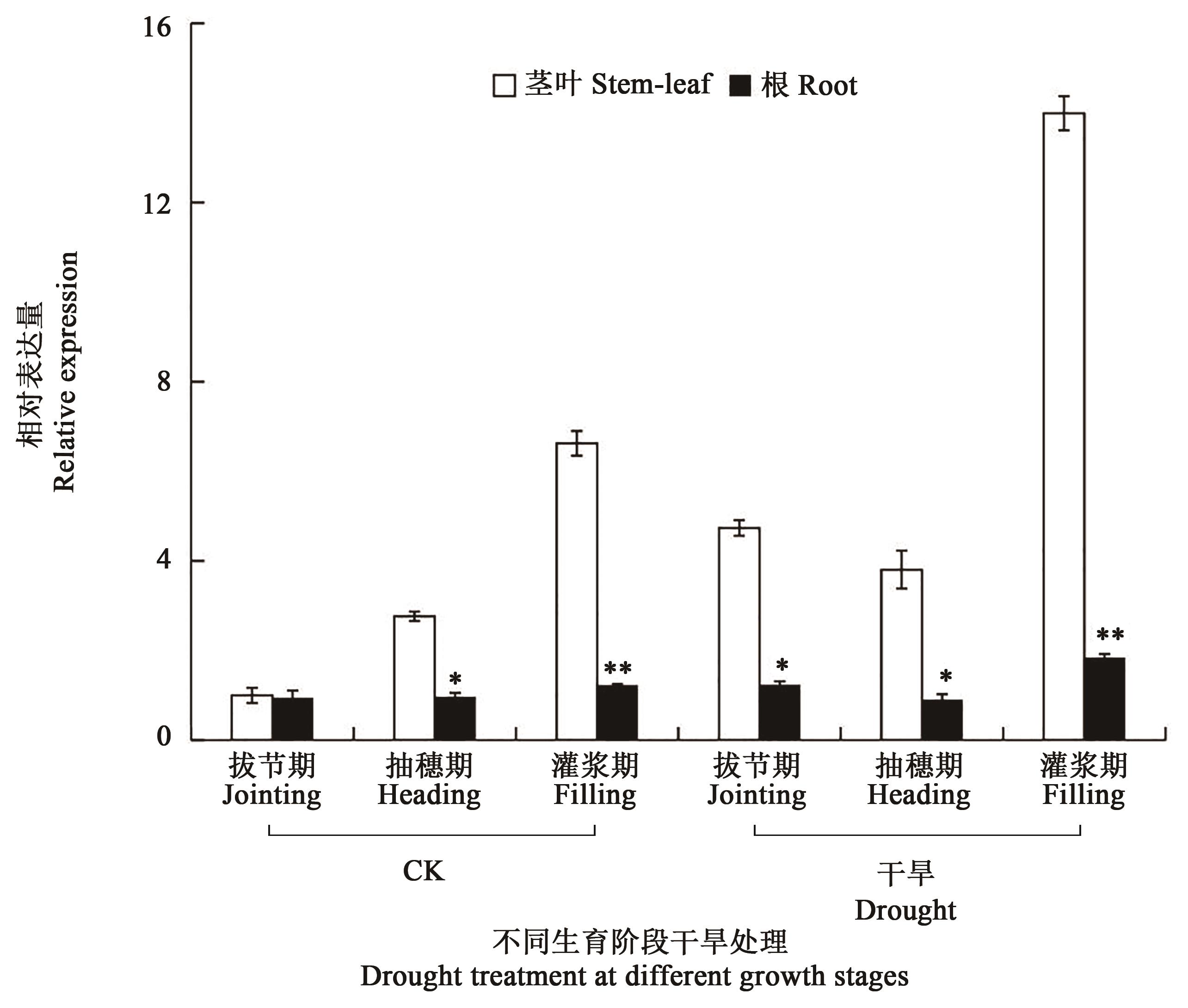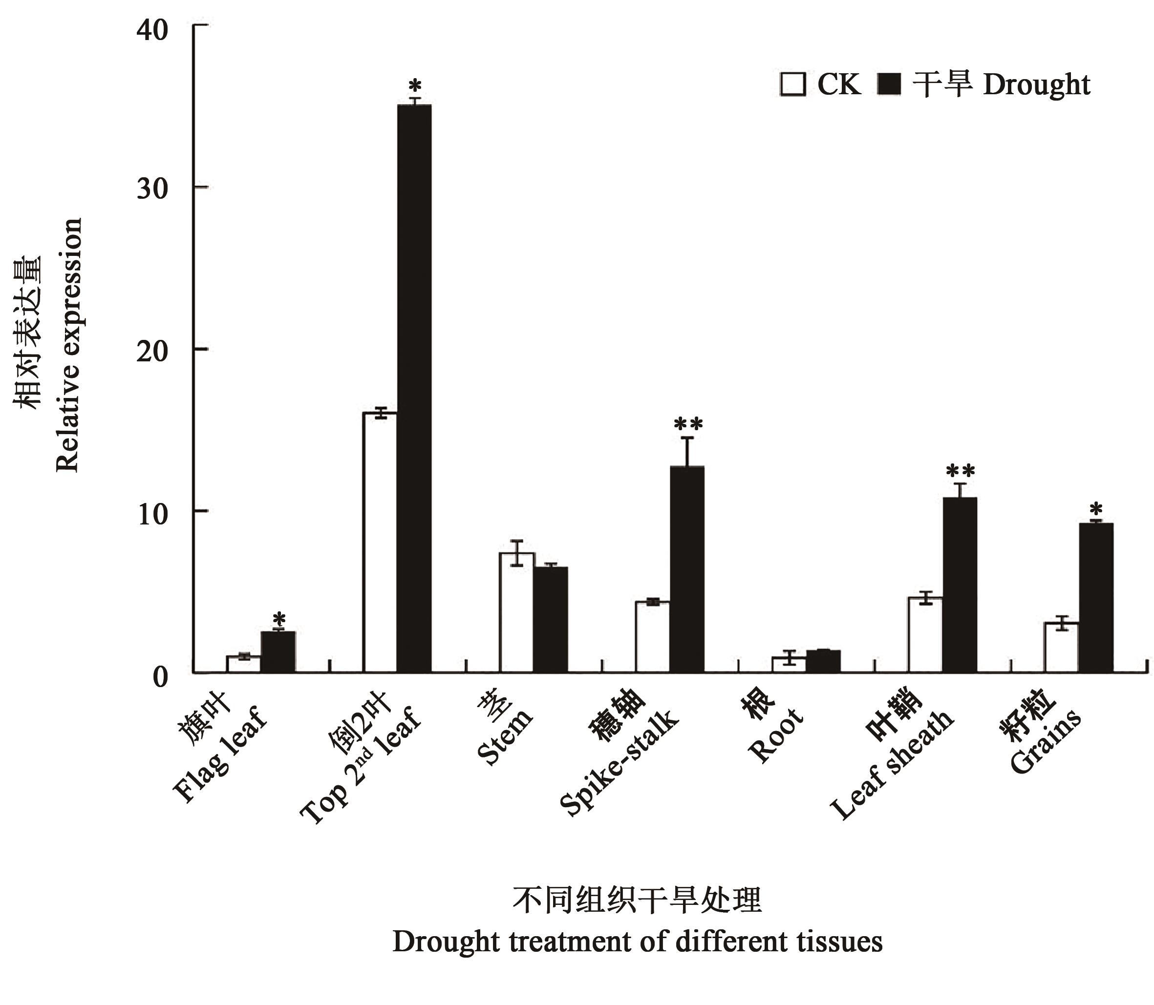 钙调磷酸酶B蛋白 (calcineurin B-like proteins, CBL)在植物逆境应答中起重要作用。前期研究表明谷子SiCBL3受干旱和盐的强烈诱导,因此对其进行系统分析。检索发现SiCBL3位于3号染色体,有2个转录本,均编码226个氨基酸,含3个典型的EF-hand功能域。亚细胞定位显示,SiCBL3蛋白主要位于液泡膜上。荧光实时定量PCR分析表明,SiCBL3广泛参与谷子苗期对PEG、盐、高温、低温和ABA等多种非生物逆境胁迫响应;SiCBL3在正常抽穗和灌浆期表达量较高,且在谷子拔节、抽穗和灌浆期干旱胁迫下被大量诱导。组织表达分析揭示,SiCBL3主要在地上部的倒2叶、茎杆、叶鞘、穗等器官中表达,而在地下部根中表达量较低;不同生育阶段SiCBL3在茎叶中表达量较高,在根中较低;灌浆期SiCBL3主要在倒2叶、茎、穗轴、叶鞘、籽粒等地上部组织中表达,而且在干旱胁迫下被大量诱导。这些结果表明,SiCBL3主要在地上部组织中高效表达,在生长中后期积极地参与植物对干旱等逆境胁迫响应,特别是在灌浆期干旱胁迫应答中起重要作用。研究结果为解析谷子CBL家族基因在逆境应答中的功能奠定基础。
