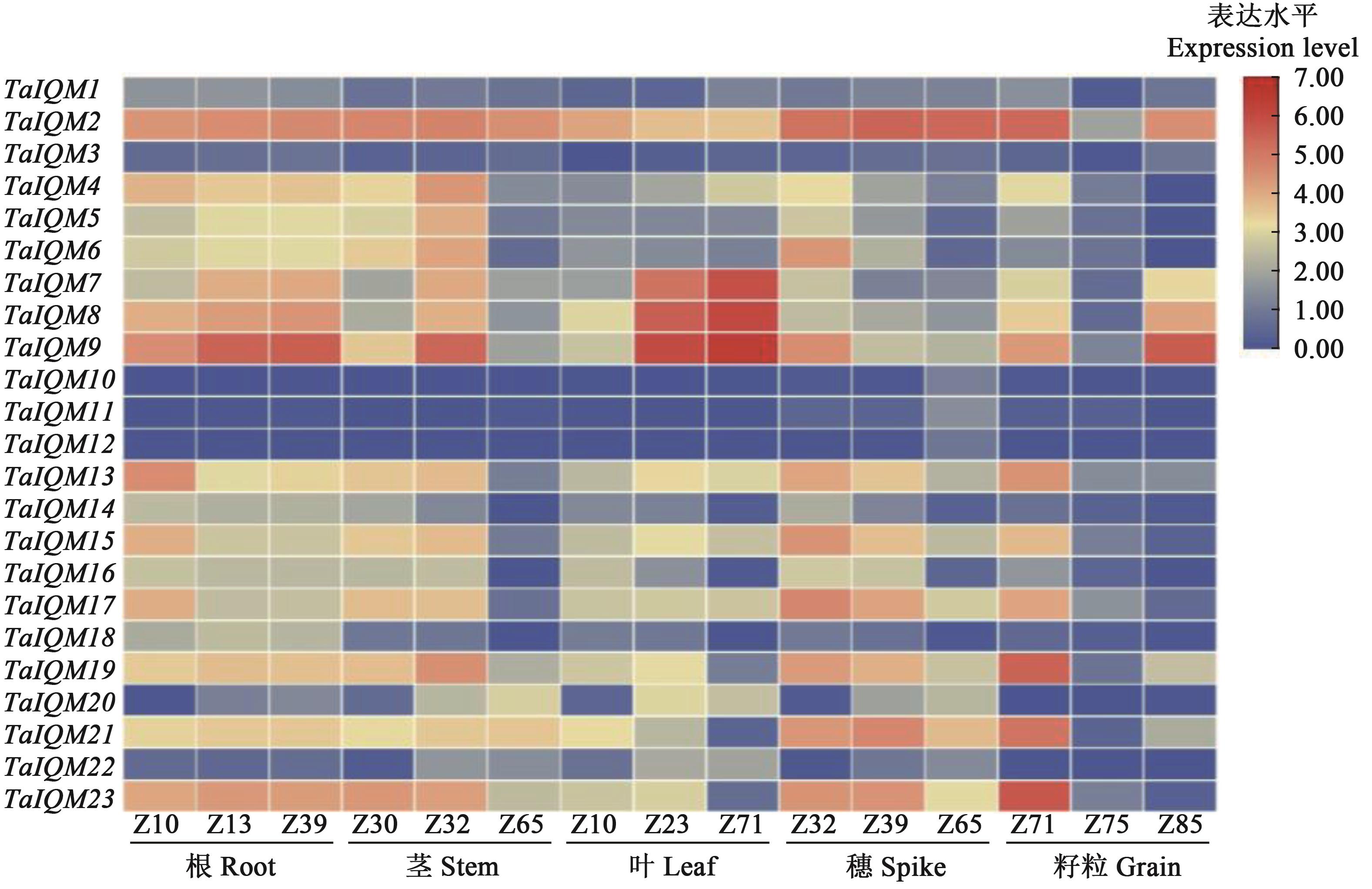 Fig. 4 Heat map of relative expression level of TaIQM genes in different tissuesNote: Red color indicates up-regulation expression, blue color indicates down-regulation expression. Z10—1 leaf period; Z13—3 leaves stage; Z23—Early tillering; Z30—Standing stage; Z32—Early jointing stage; Z39—Late jointing stage; Z65—Middle flowering; Z71—2 d after flowering; Z75—10 d after flowering; Z85—30 d after flowering.