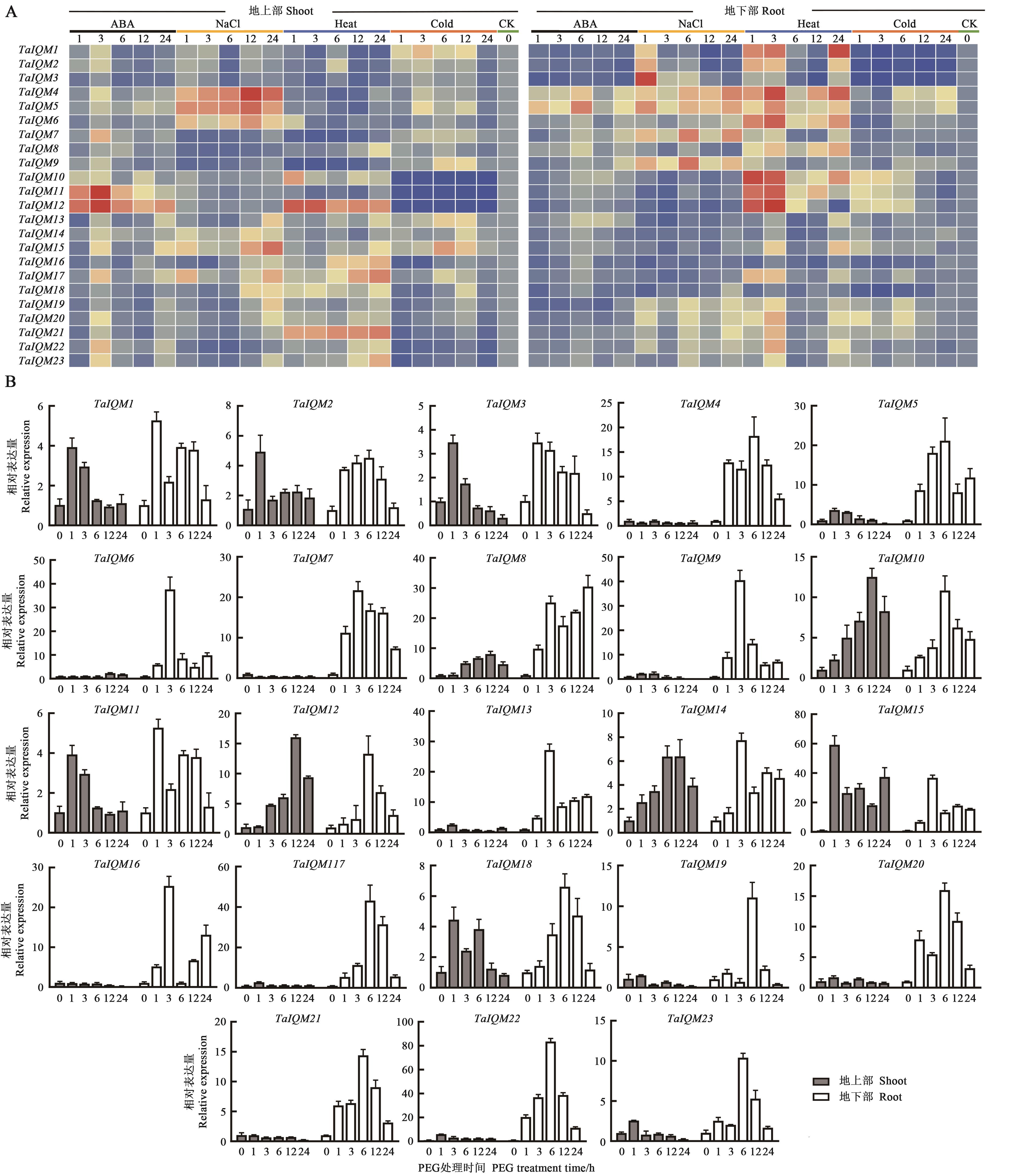 Fig. 5 Expression analysis of IQM genes in wheat under abiotic stressesA: Relative expressionunder ABA, NaCl, heat and clod; B: Relative expression under drought.Red color indicates up-regulation expression, blue color indicates down-regulation expression
