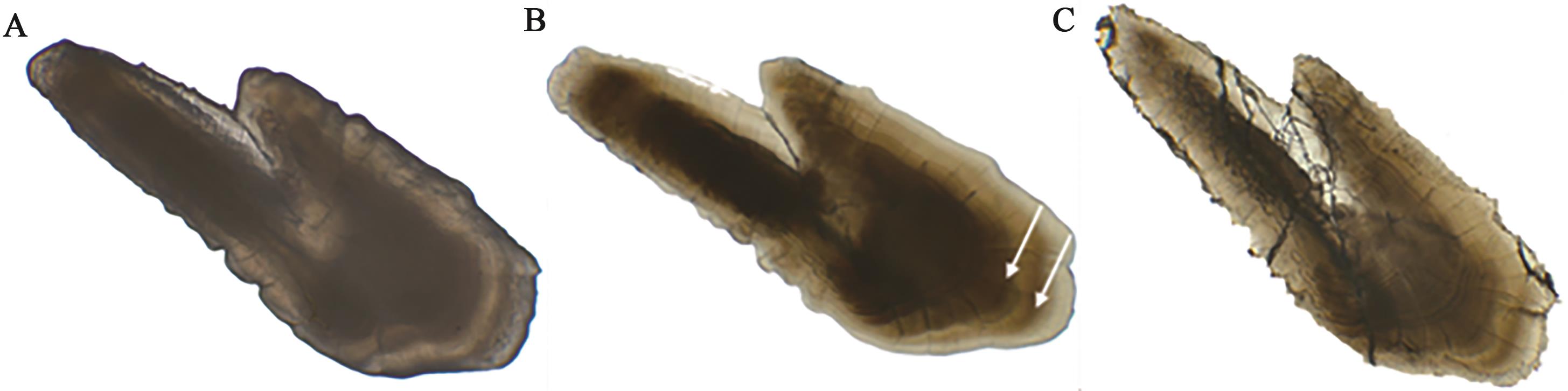Fig. 1 Otolith image of the Sardinops sagaxA:Untreated otoliths;B:Otolith after embedding and manual grinding;C:Otolith overground after embedding. The picture shows the otoliths of Sardinops sagax with fork length of 165 mm and age of 2+ ; the position indicated by the white arrow is the otoliths growth ring