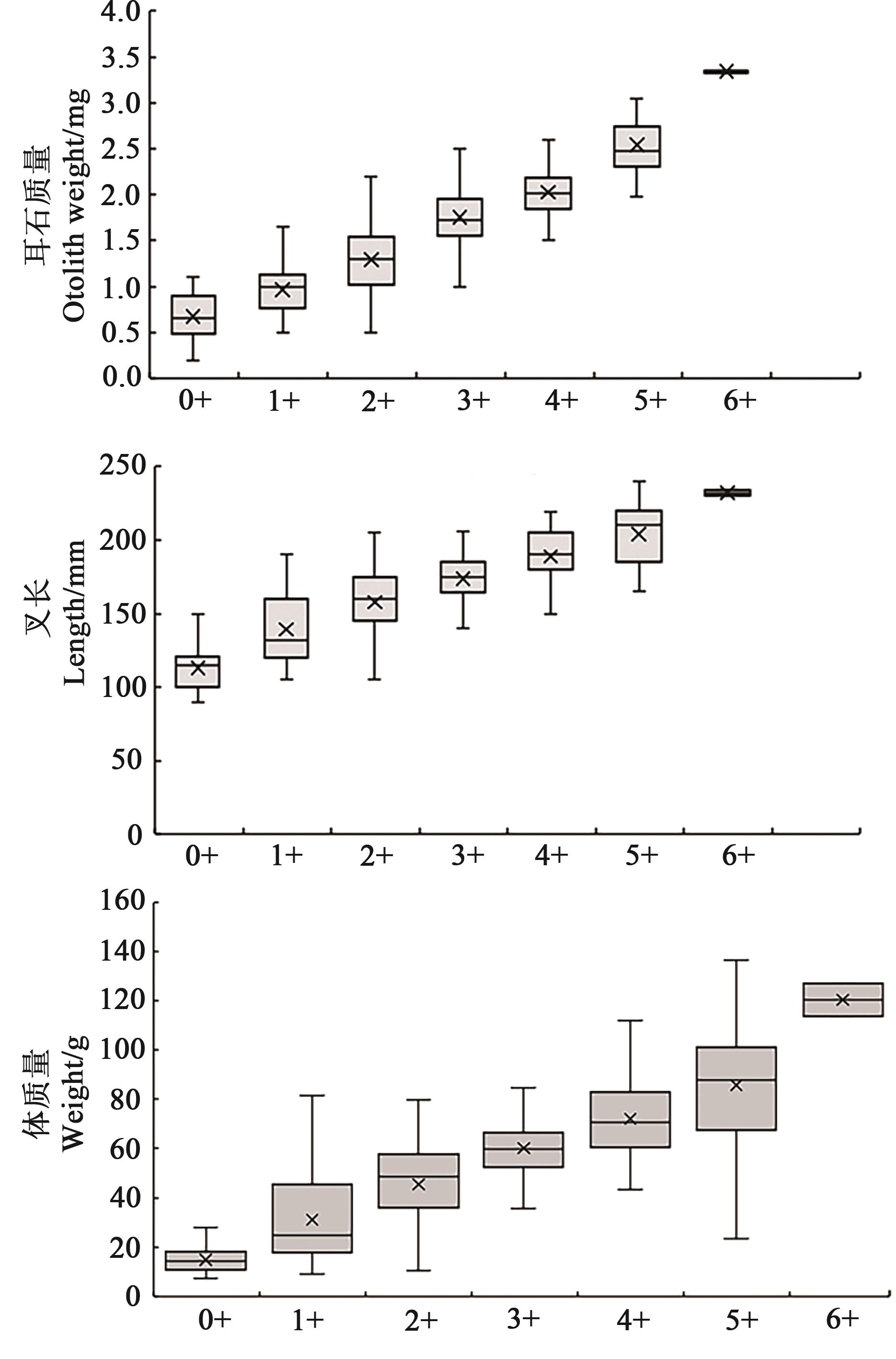 体质量Weight/g 耳石质量Otolish weight/mg | 5.6~144.6 0.20~3.35 | 43.7 1.37 |
