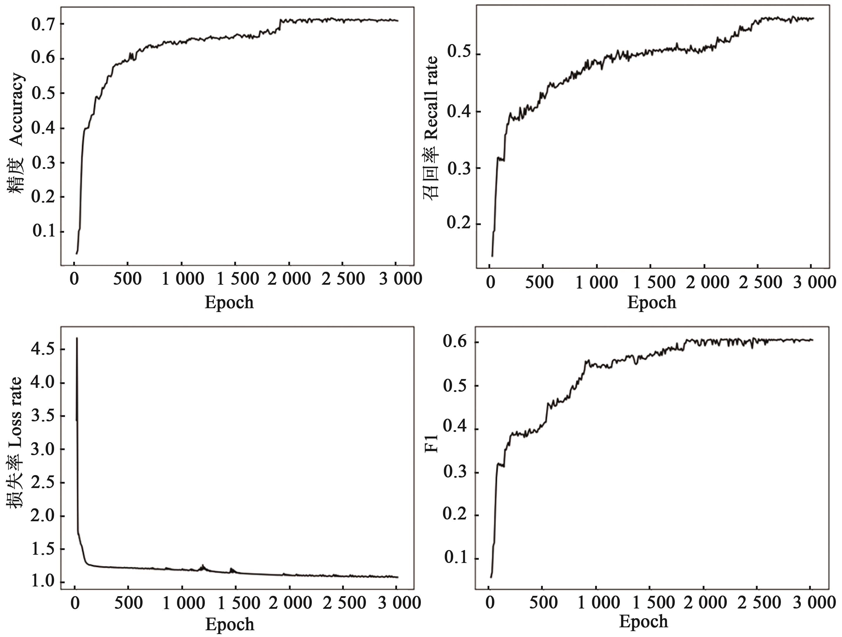 Fig. 6 Iteration diagram of accuracy、recall rate、loss rate、F1 value and training timesNote: The figure shows the parameters of each index without error.