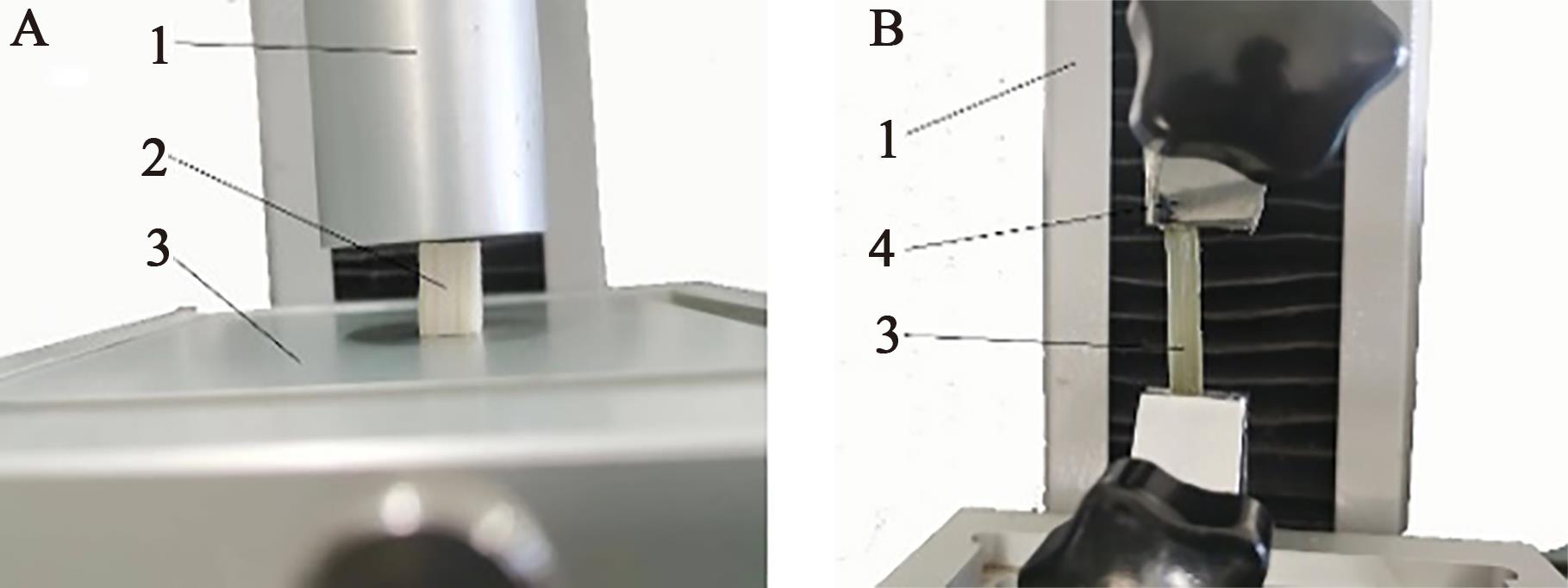 Fig. 2 Shear modulus determination of straw core and leafA: Shear test of straw core; B: Shear test of leaves; 1—Texture analyzer cutter; 2—Straw core; 3—Bottom plate; 4—Leaf