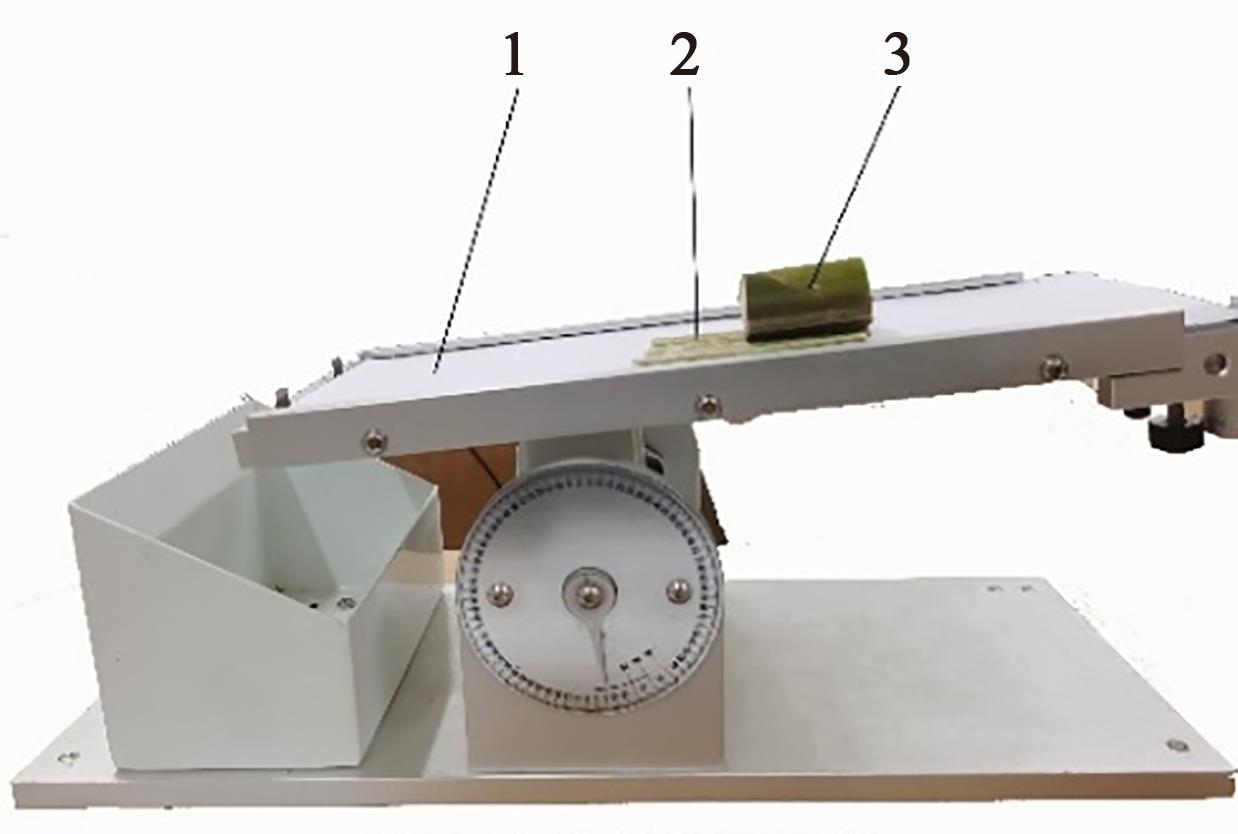 Fig. 1 Determination of elastic modulus of straw core and leafA: Shear test of straw core; B: Shear test of leaves; 1—Texture analyzer cutter; 2—Straw core; 3—Bottom plate; 4—Leaf