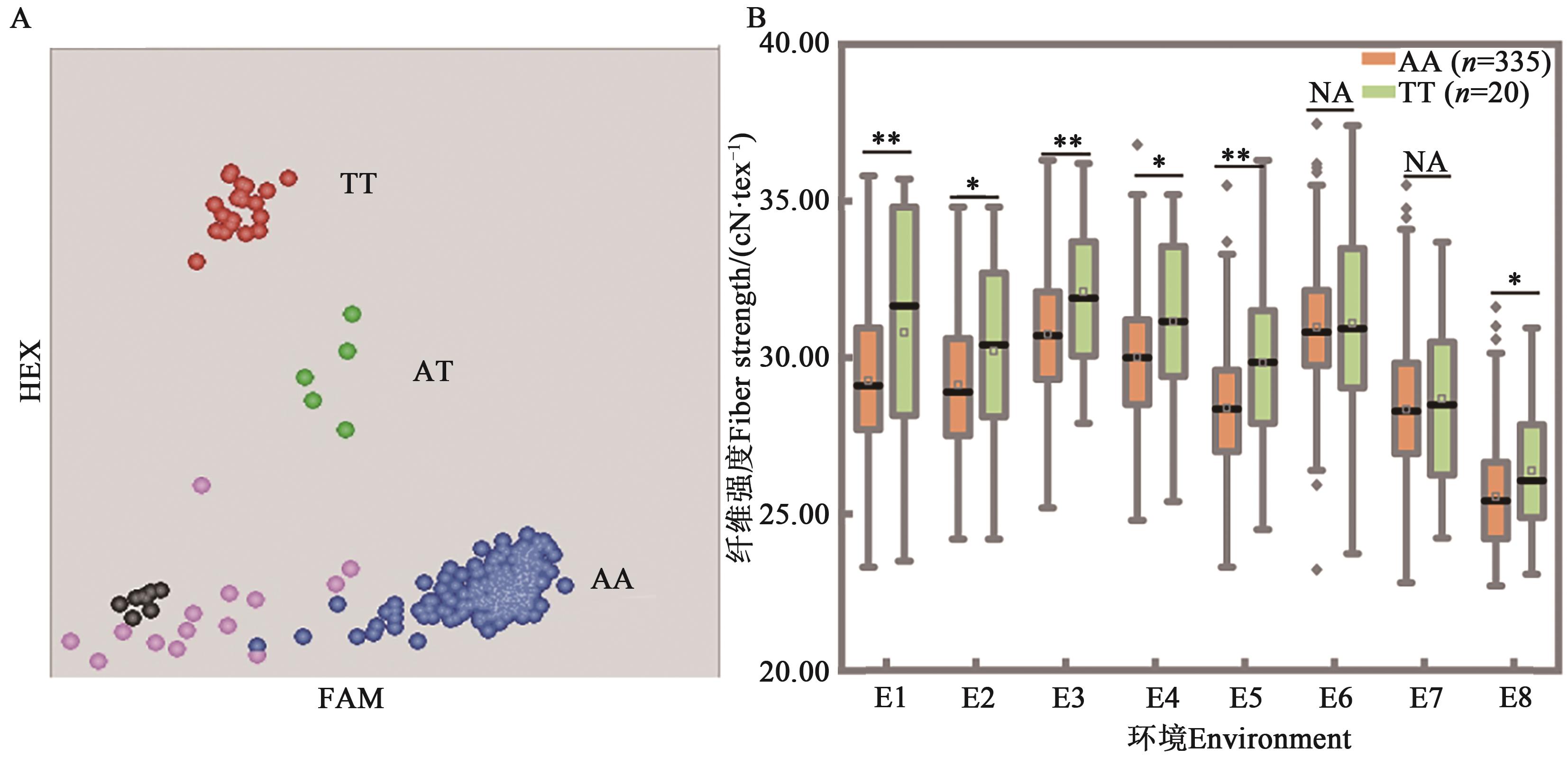 Fig. 2 Genotyping results of FS-15 in the population and allelic effects on fiber strengthA: Genotyping results of accessions, each dot represents 1 material,the red and blue represent homozygous, green represents heterozygous, pink represents failed data and black represents the non-template control, respectively; B: Allele effects, * and ** indicate significant difference at P<0.05 and P<0.01 levels, respectively, and NA indicates no significant difference; code of environment is same as Table 2