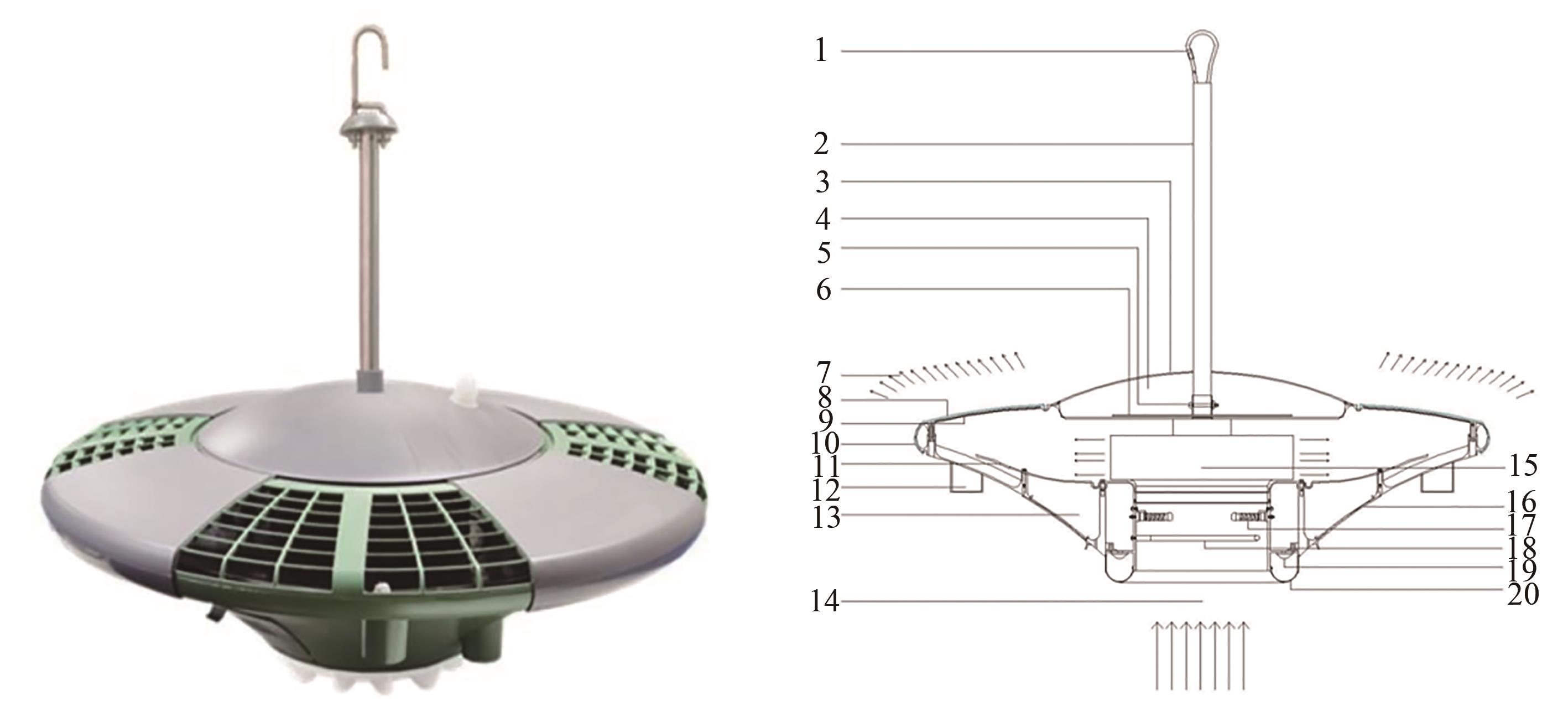 Fig. 2 Structure of multi-functional plant protection machineNote: 1—Safety hook; 2—Boom; 3—Protective cover; 4—Upper chamber; 5—Attachment bolt; 6—Attachment base; 7—Air outlet; 8—Wind direction adjusting plate; 9—Filter; 10—Plastic shell; 11—Airflow guide plate; 12—Temperature and humidity sensor; 13—Bug corpse compartment; 14—Air inlet; 15—Fan; 16—Insects compartment door; 17—Ozone generator; 18—Heating tube; 19—Yellow and blue insect trapping lamp; 20—Insect trapping lamp cover.