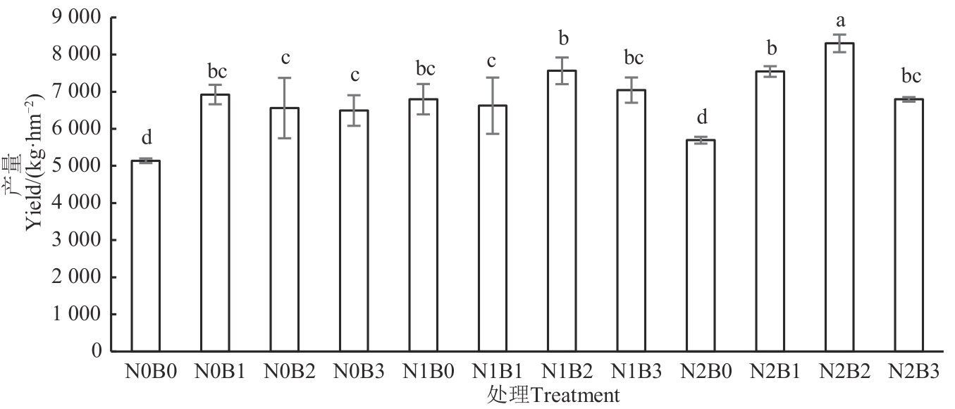 Fig. 4 Spring wheat yield under different treatmentsNote:Different lowercase letters indicate significant differences among different treatments at P<0.05 level.
