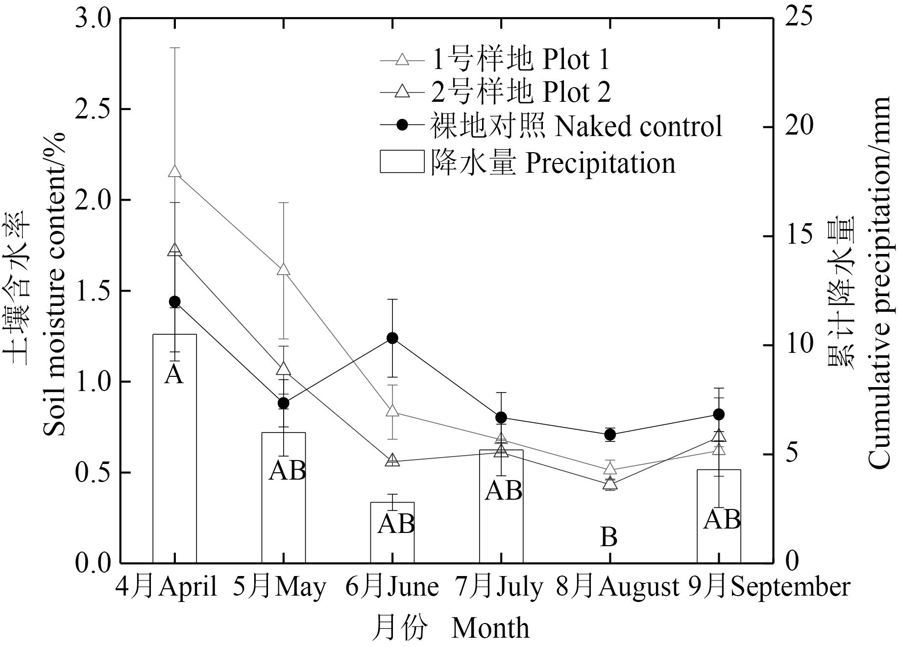 Fig. 5 Soil moisture content and precipitation in different locations from April to SeptemberNote: Different capital letters indicate significant differences between different months at P<0.05 level.