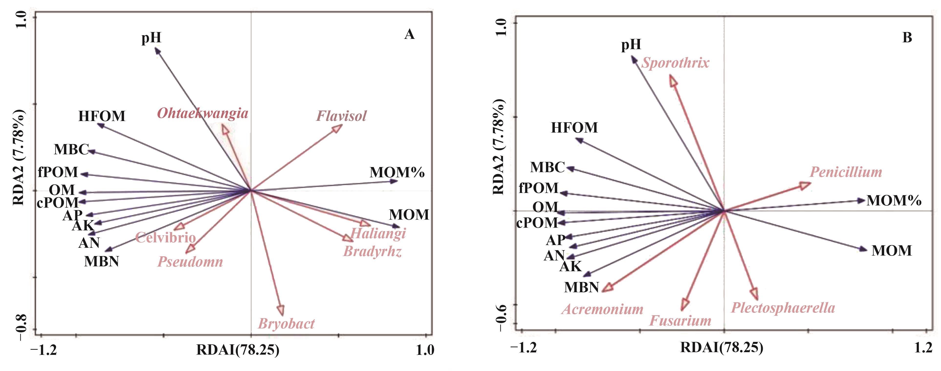 为进一步明确有机肥增施对植烟土壤微生态环境的影响及其内在相互作用,通过田间试验,在常规化学肥料基础上分别增施0、3 000、6 000和12 000 kg·hm-2有机肥,研究其对土壤有机质组分、理化性质及微生物群落特征的影响。结果表明,增施有机肥显著提升了植烟土壤pH及有机质和速效养分含量;随着有机肥施入量的增加,土壤颗粒有机质、水溶性有机碳、微生物量碳氮及轻组有机质含量均呈现增加趋势,其中有机质含量提升7%~28%,速效钾含量提升10%~61%,微生物量碳提升14%~20%,微生物量氮提升24%以上。增施有机肥处理提高植烟土壤细菌与真菌的ACE指数,土壤中变形菌门、担子菌门、枝顶孢霉属、假单胞菌属等有益菌群的丰度明显增加;BryobacterHaliangium等菌群丰度明显降低,且其丰度与土壤活性有机质含量呈负相关。综上所述,增施有机肥刺激了土壤有益微生物菌群的生长和繁殖,提高了植烟土壤活性有机质组分含量,改善了土壤理化性状。