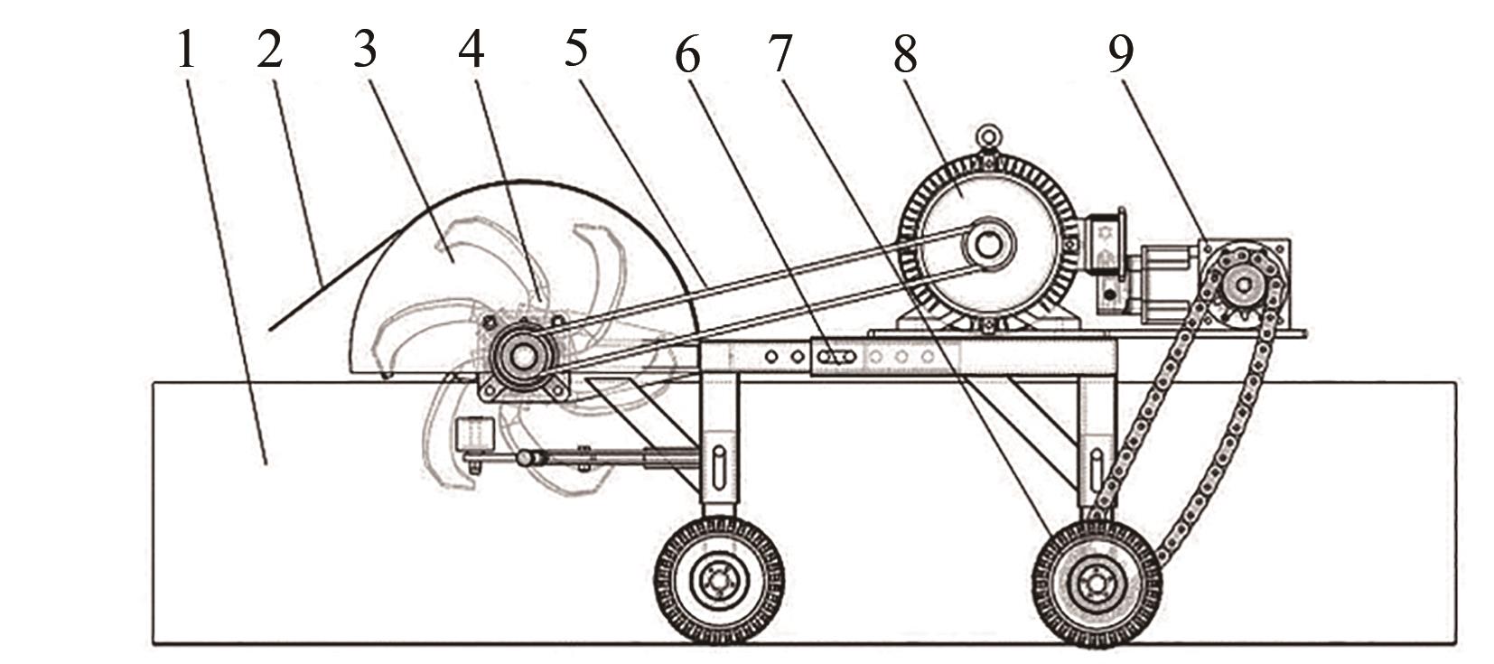 Fig. 7 Sand soil mixing test benchNote:1—Sand trough; 2—Sand deflector (angle adjustable); 3— Cover; 4—Rotary blade roller; 5—Drive belt; 6—Frame; 7—Traveling wheel; 8—Driving motor; 9—Traveling deceleration mechanism.