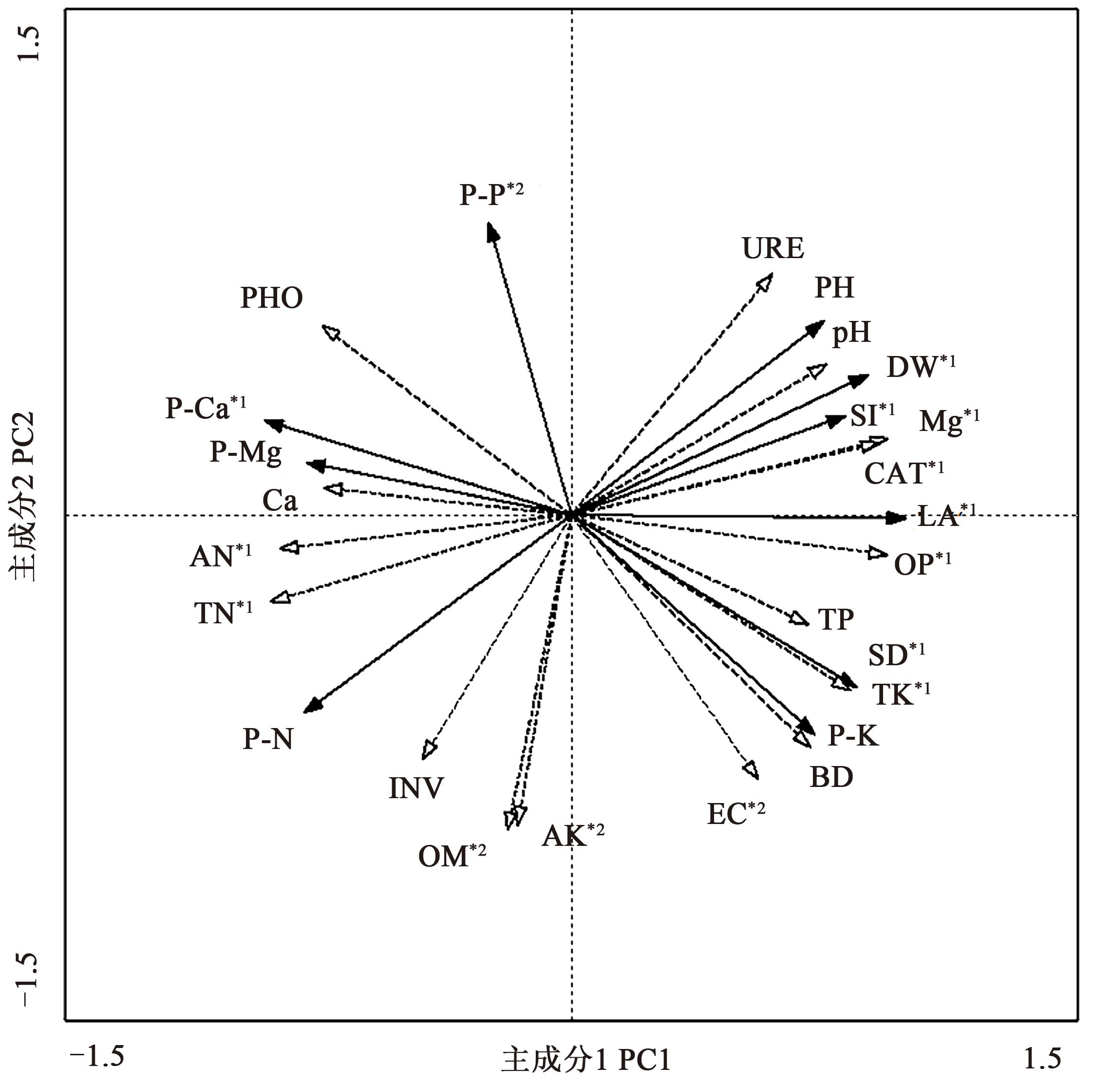 Fig. 3 Relationship between the physicochemical properties of substrate and the indicators of plant traitsNote: P-N—Plant N content; P-P—Plant P content; P-K—Plant K content; P-Ca—Plant Ca content; P-Mg— Plant Mg content; PH—Plant height; SD—Stem diameter; LA—Leaf area; DW—Total dry weight; SI—Seedling index; BD— Bulk density; OM—Organic matter; TN—Substrate total N; TP—Substrate total P; TK—Substrate total K; AN—Alkali N; OP—Olsen P; AK—Available K; INV—Invertase; URE—Urease; PHO— Phosphatase; CAT—Catalase. The solid line represents the original variables for principal component analysis, the dashed line represents the supplementary variables for principal component analysis. *1 represents that the index is significantly correlated with principal component 1 (PC1), *2 represents that the index is significantly correlated with principal component 2 (PC2).