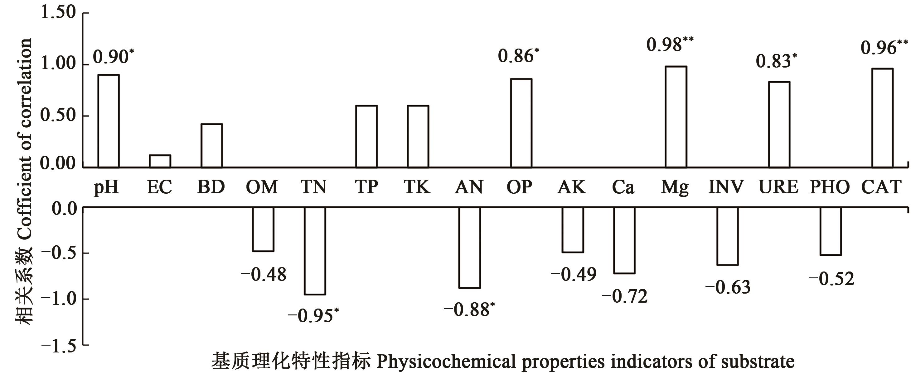 Fig. 4 Coefficient of correlation between physicochemical properties of substrate and comprehensive evaluation score of plantsNote: * and ** indicate significant correlations at P<0.05 and P<0.01 levels, respectively;letter code is same to Figure 3.