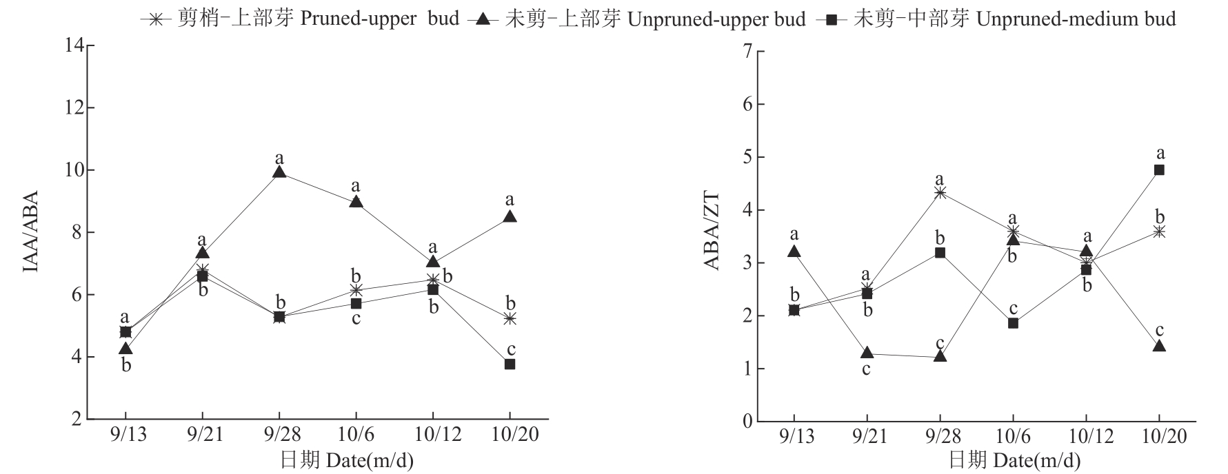 Fig. 4 Value of IAA/ABA and ABA/ZT in different parts of bud under different treatmentsNote: Different lowercase letters indicate significant differences between different treatments at same time at P<0.05 level.