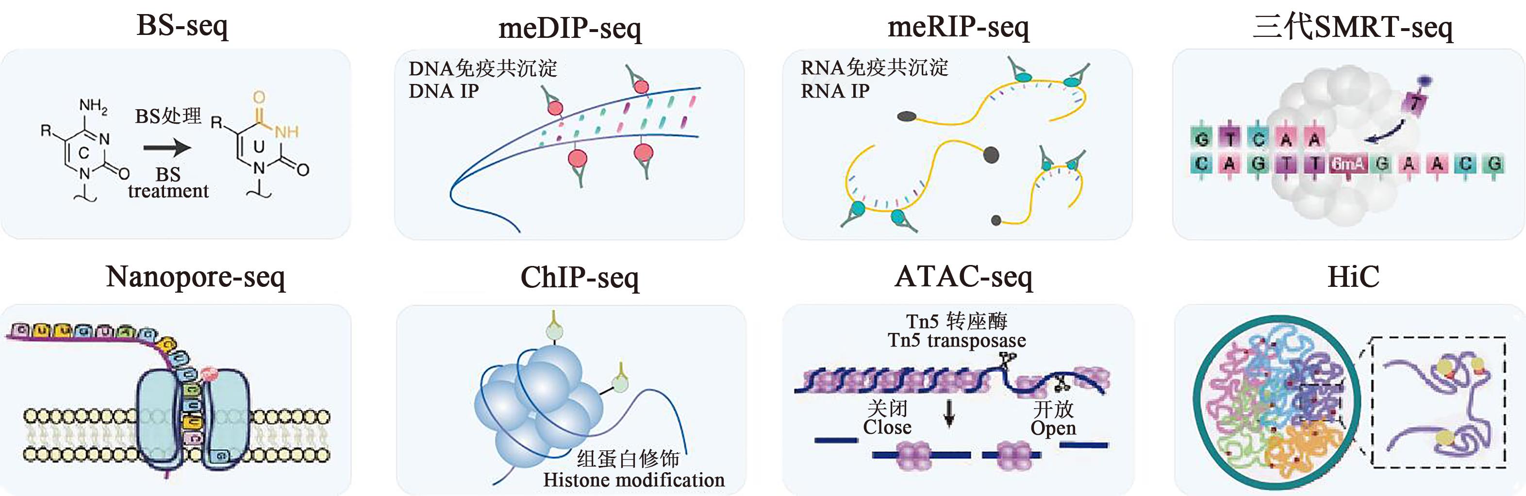 Fig. 2 Technologies relevant to epigenomeBS-seq:Bisulfite sequencing; MeDIP-seq: Methylated DNA immunoprecipitation sequencing; MeRIP-seq: Methylated RNA immunoprecipitation sequencing; ChIP-seq: Chromatin immunoprecipitation sequencing; SMRT-seq: Single-molecule real-time sequencing;Nanopore-seq: Nanopore sequencing; ATAC-seq: Assay for transposase-accessible chromatin with high-throughput sequencing (HTS); HiC: High-throughput chromosome conformation capture technology