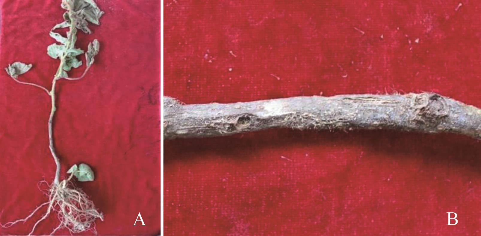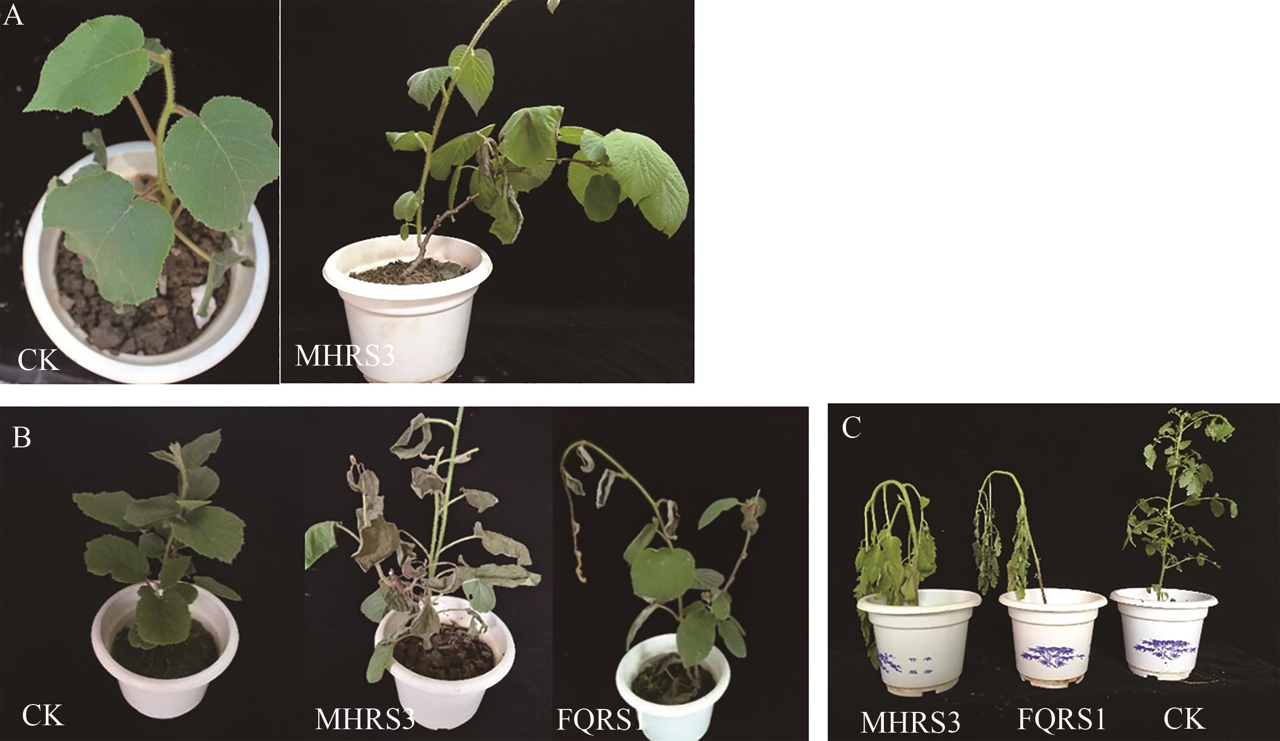 Fig. 2 Pathogenicity test of strains (MHRS3 as an example)A: 7 d after inoculation kiwi seedlings with stabbing; B: 14 d after inoculation kiwi seedlings through wounded root; C: 14 d after inoculation tomato seedlings through wounded root