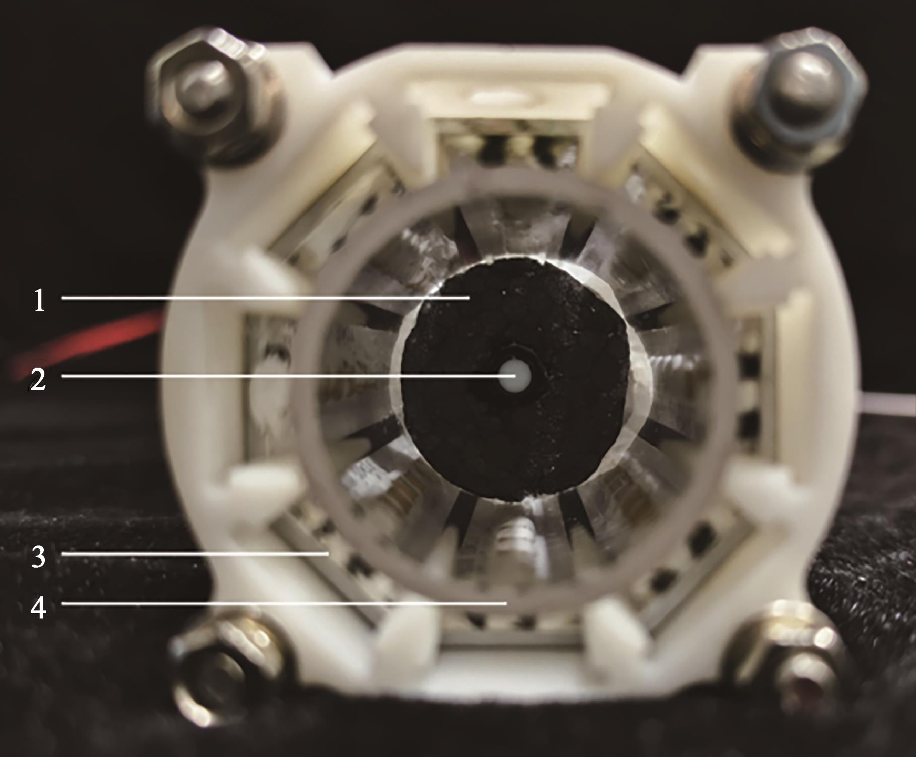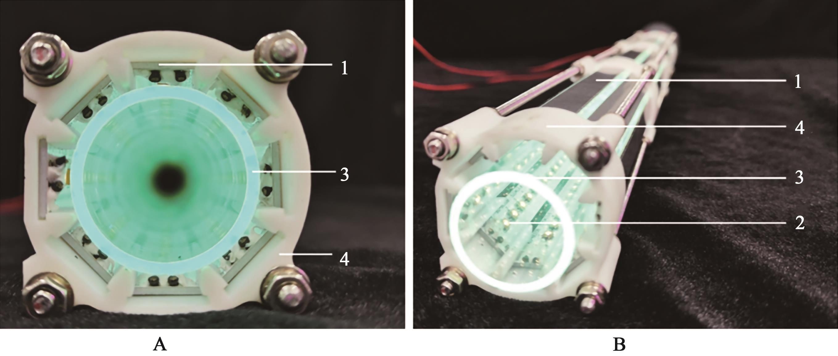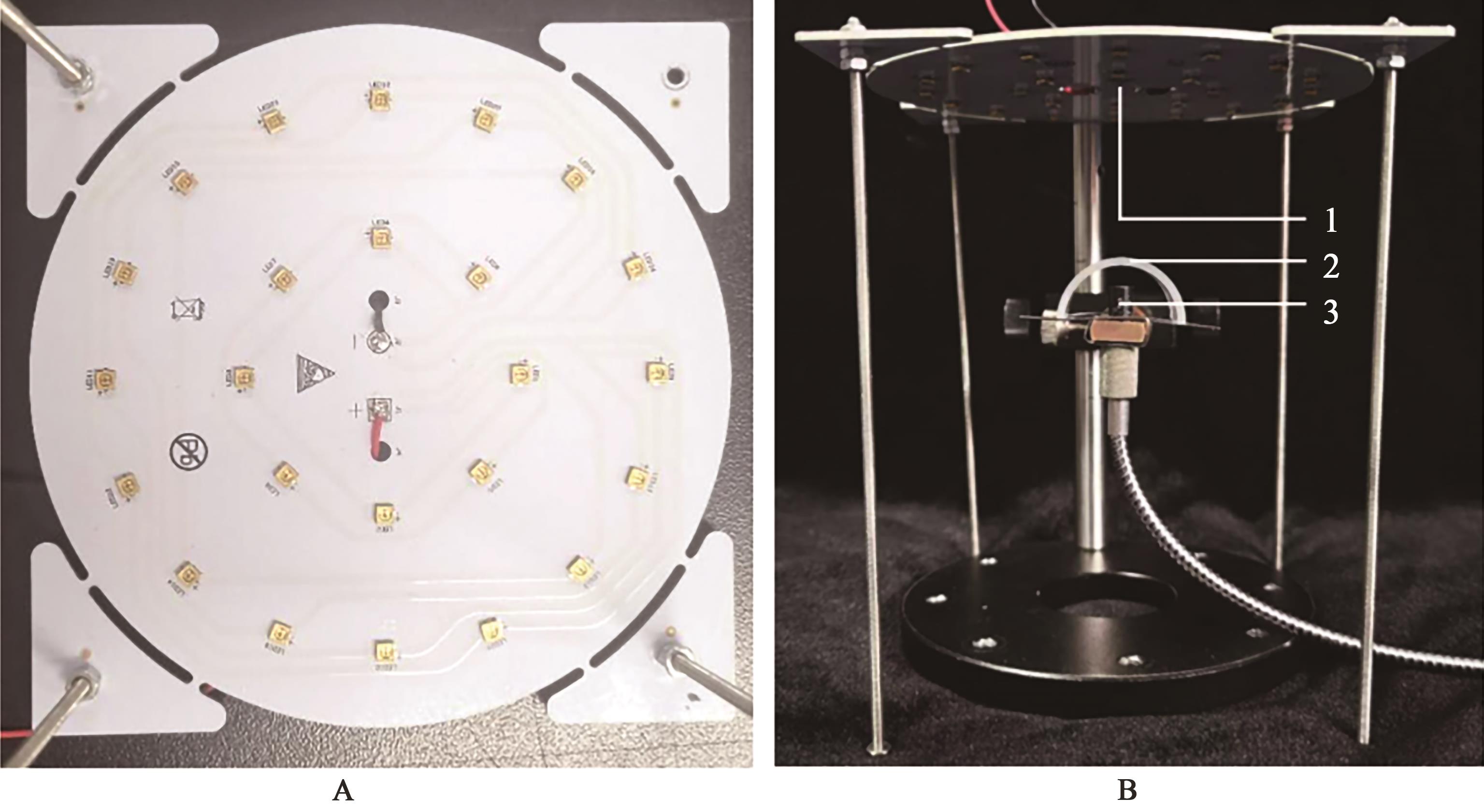Fig. 3 Measurement of transmittance for quartz tubeA:UV-LED measurement board; B:UV transmittance measurement device for quartz tube. 1—UV-LED measurement board; 2—Semicircular quartz plate with the same specifications as quartz tube; 3—Measurement probe of ultraviolet spectrometer