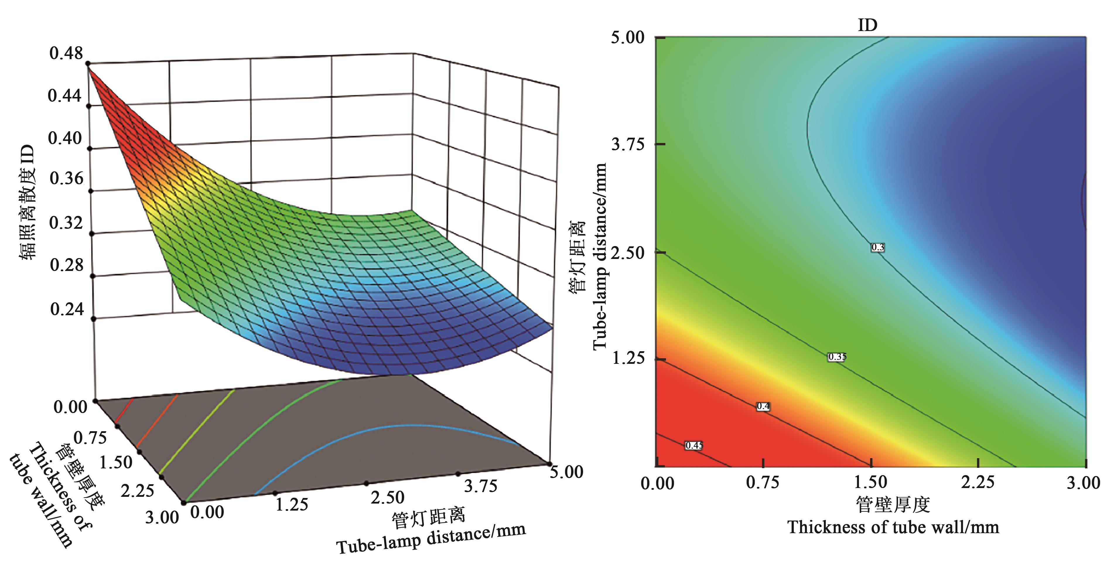 序号 Number | 管道内径 Inner diameter of tube/mm | 管壁厚度Thickness of tube wall/mm | 管灯距离Tube-lamp distance/mm | 双向反射分布函数 BRDF | 有效紫外辐照比例 EURR/% | 辐照离散度ID | 复合合意度 Composite desirability |