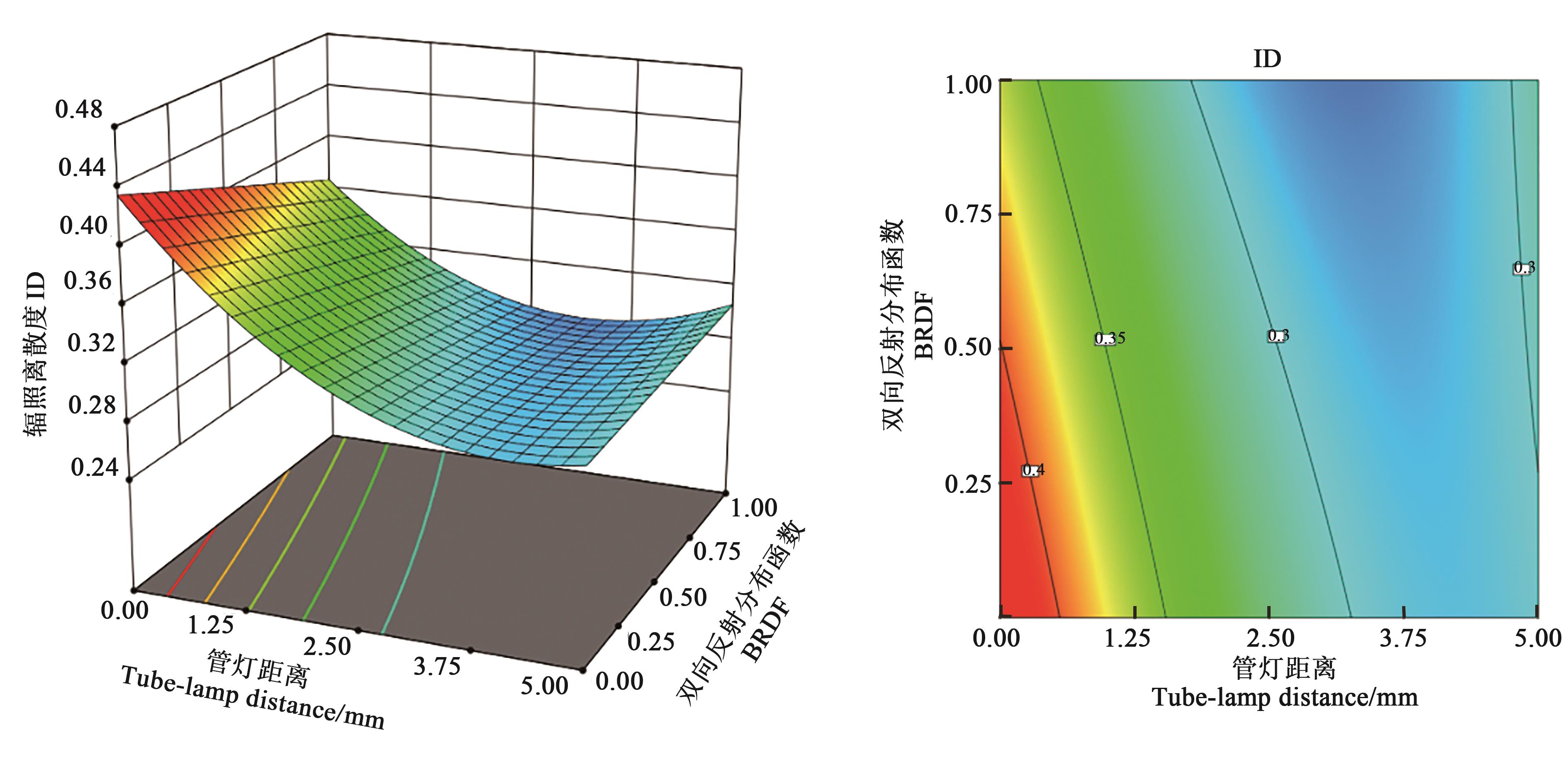 Fig. 11 Effect of single factors on effective ultraviolet radiation ratio and irradiance dispersionNote:A—Inner diameter of tube;B—Thickness of tube wall;C—Tube-lamp distance;D—Bidirectional reflectance distribution function.