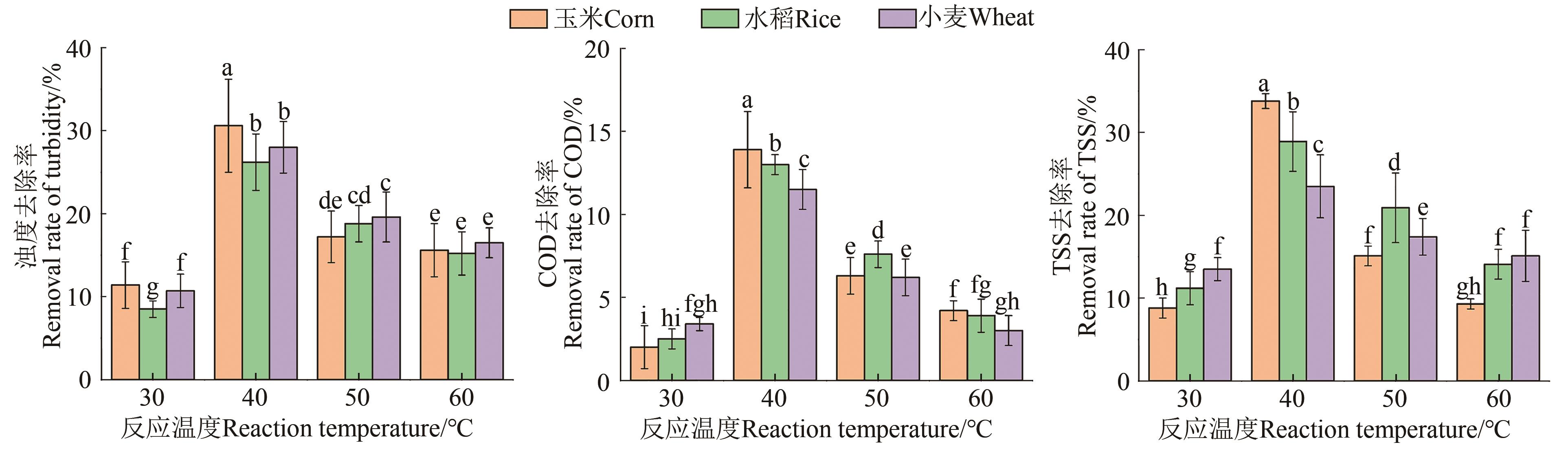 In order to develop a novel natural polymer flocculant based on crop straw, cellulose was extracted from 3 crop straws of corn, rice and wheat by nitric acid-ethanol method, and copolymerized with methacryloxyethyltrimethyl ammonium chloride (DMC) in homogeneous aqueous solution (reaction temperature of 30, 40, 50 and 60 °C) to generate straw cellulose grafted methacryloxyethyltrimethyl ammonium chloride flocculant(SC-g-DMC). The results showed that the best cellulose content of the 3 crops after straw extraction was (69.8%±1.7%), and the best grafting rate of the samples was (36.9%±3.1%). Infrared spectroscopy and scanning electron microscopy (SEM) confirmed the successful grafting of monomers to the cellulose surface of straw. The flocculation effect of SC-g-DMC on dairy farm sewage showed that under different reaction temperatures, the pollutant removal efficiency first increased and then decreased with the rise of reaction temperature. The SC-g-DMC prepared at 40 ℃ had the best flocculation effect. The removal rate of chemical oxygen demand, turbidity and total suspended solids of 100 mg·L-1 SC-g-DMC on dairy wastewater was (13.9%±2.3%), (30.6%±5.6%) and (33.8%±0.9%), respectively. Above results showed that the flocculant had a good application prospect and could provide basic data for the application of new natural polymer flocculants.