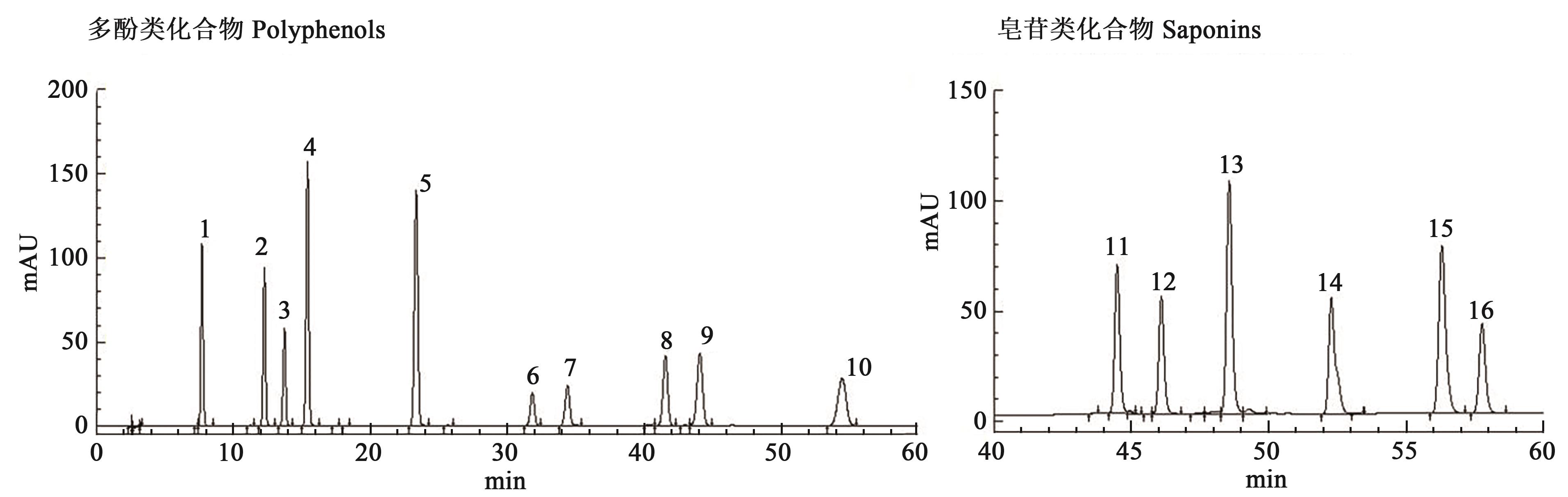 Fig. 1 Comparison peaks of 10 polyphenols and 6 saponinsNote:1—Neochlorogenicacid; 2—Chlorogenicacid; 3—Cryptochlorogenicacid; 4—Caffeicacid; 5—P-hydroxycinnamicacid; 6—Rutin; 7—Isoquercitrin 8—IsochlorogenicacidB; 9—Isochlorogenicacid A; 10—Isochlorogenicacid C; 11—Phyllosaponin F; 12—Phyllosaponin H; 13—Phyllosaponin C; 14—Phyllobutein E; 15—Phyllobutein D; 16—Phyllobutein F.