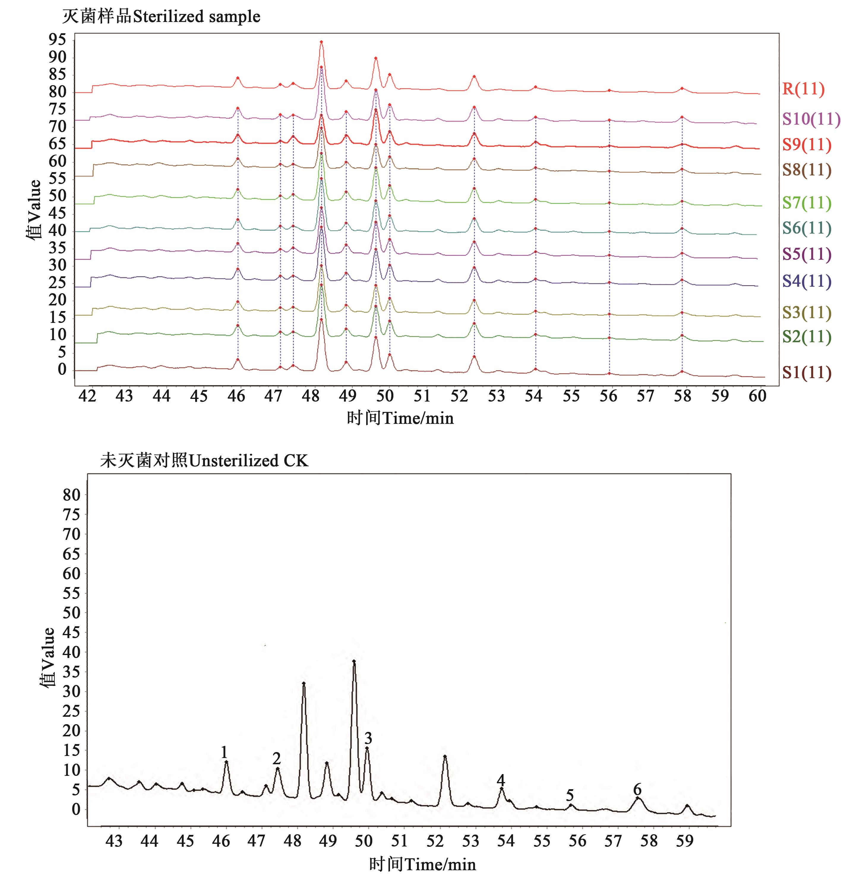 Fig. 3 HPLC fingerprint of saponins in sterilized sampleNote:R—Control map; S1—Unsterilized sample; S2~S10—Sterilized samples. 1—Phyllosaponin F; 2—Phyllosaponin H; 3—Phyllosaponin C; 4—Phyllobutein E; 5—Phyllobutein D; 6—Phyllobutein F.